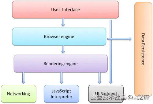 - 呈现引擎 - 负责显示请求的内容。如果请求的内容是 HTML,它就负责解析 HTML 和 CSS 内容,并将解析后的内容显示在屏幕上。