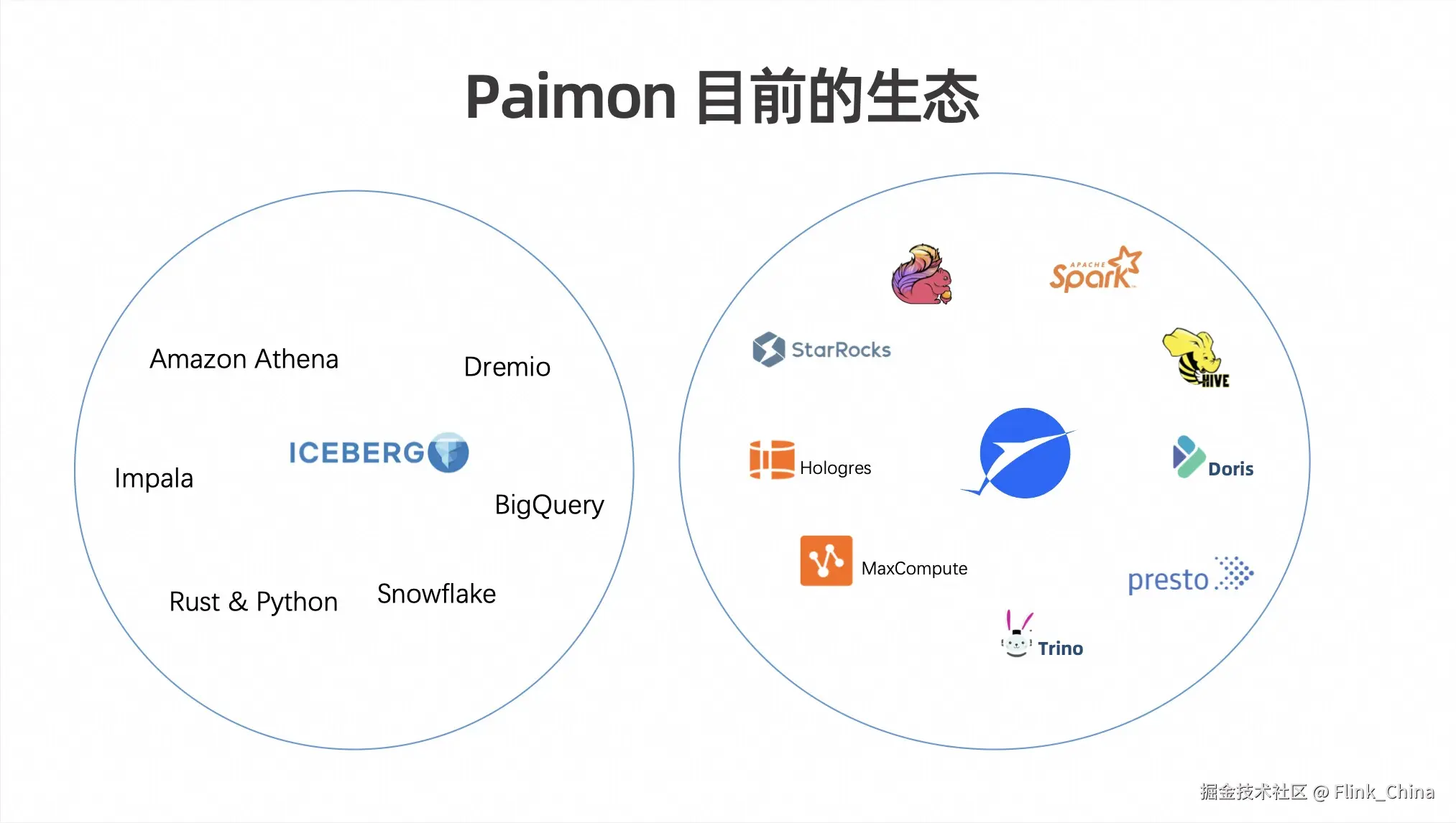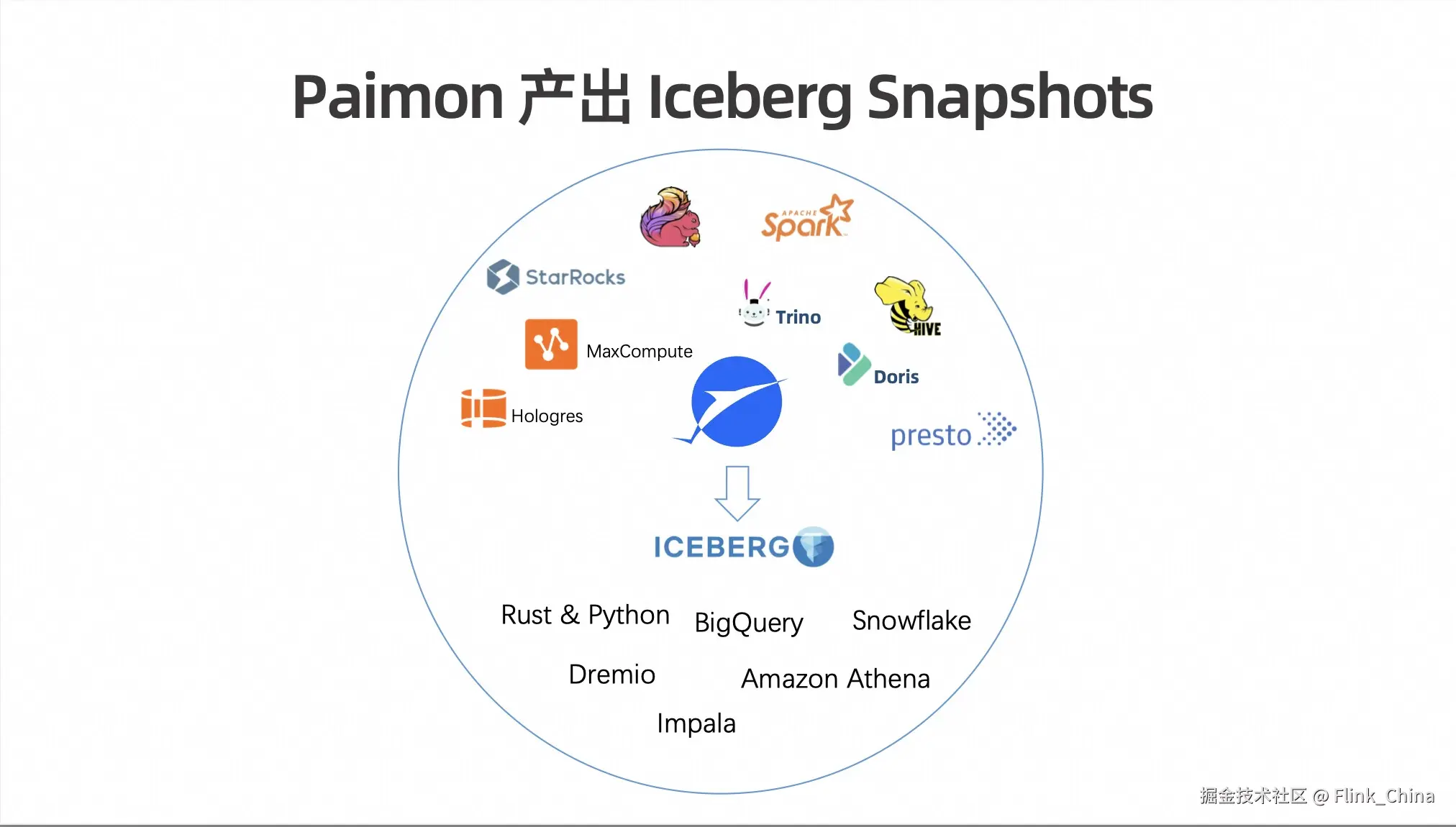 目前在国外比较流行的这个 Iceberg 有哪些生态呢?上图左边的圆内,包括 Amazon Athena、Dremio、Impala、BigQuery、Snowflake 和丰富的 Rust & Python库。