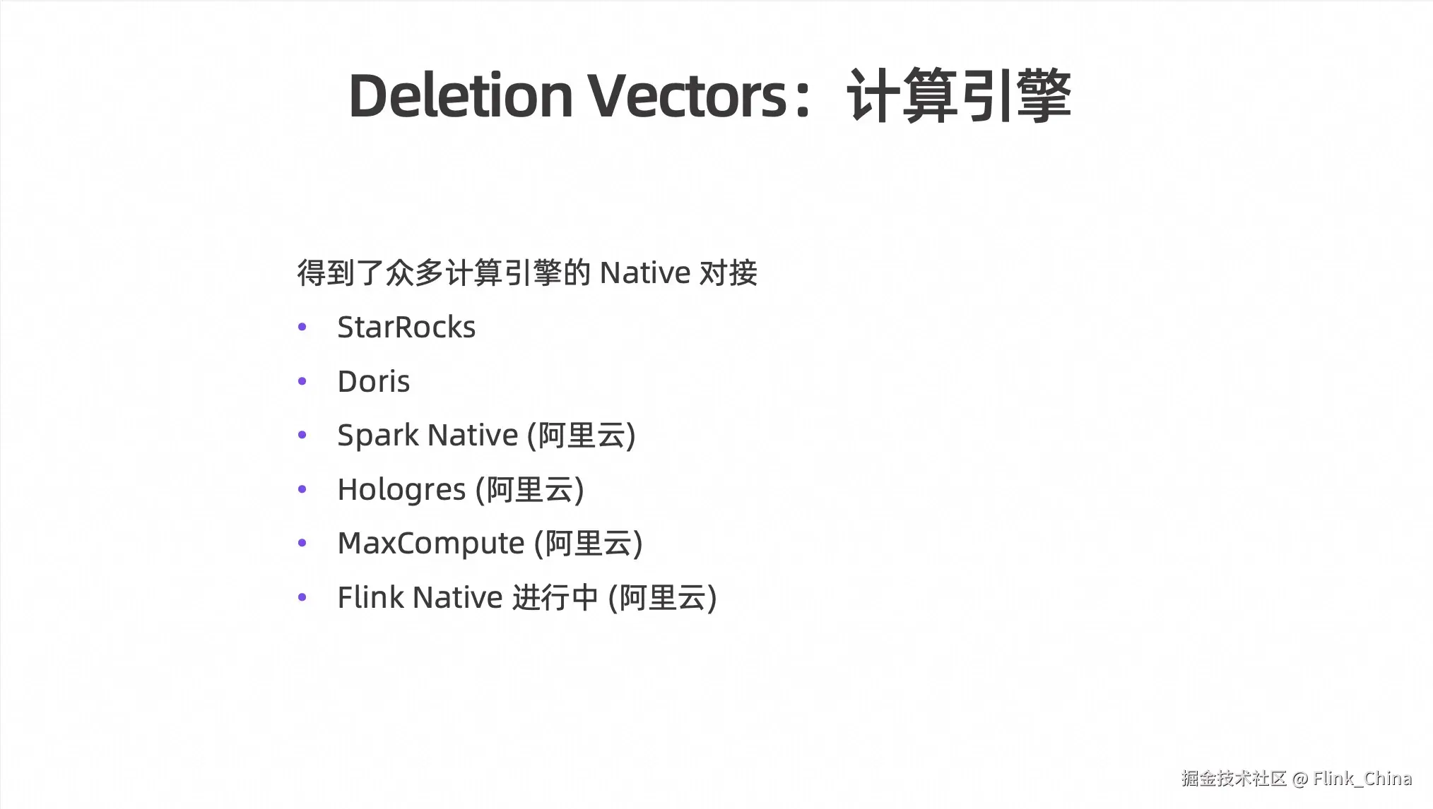 Deletion Vectors 已经得到了众多计算引擎的 Native 对接。虽然在0.8版本时还不够完善,但在 0.9 版本之后得到了丰富,并与阿里云的一些产品集成。目前,已经对接了多个计算引擎,包括开源的 StarRocks、Doris,以及阿里云的产品如 Spark Native、Hologres、MaxCompute 和 Flink Native。