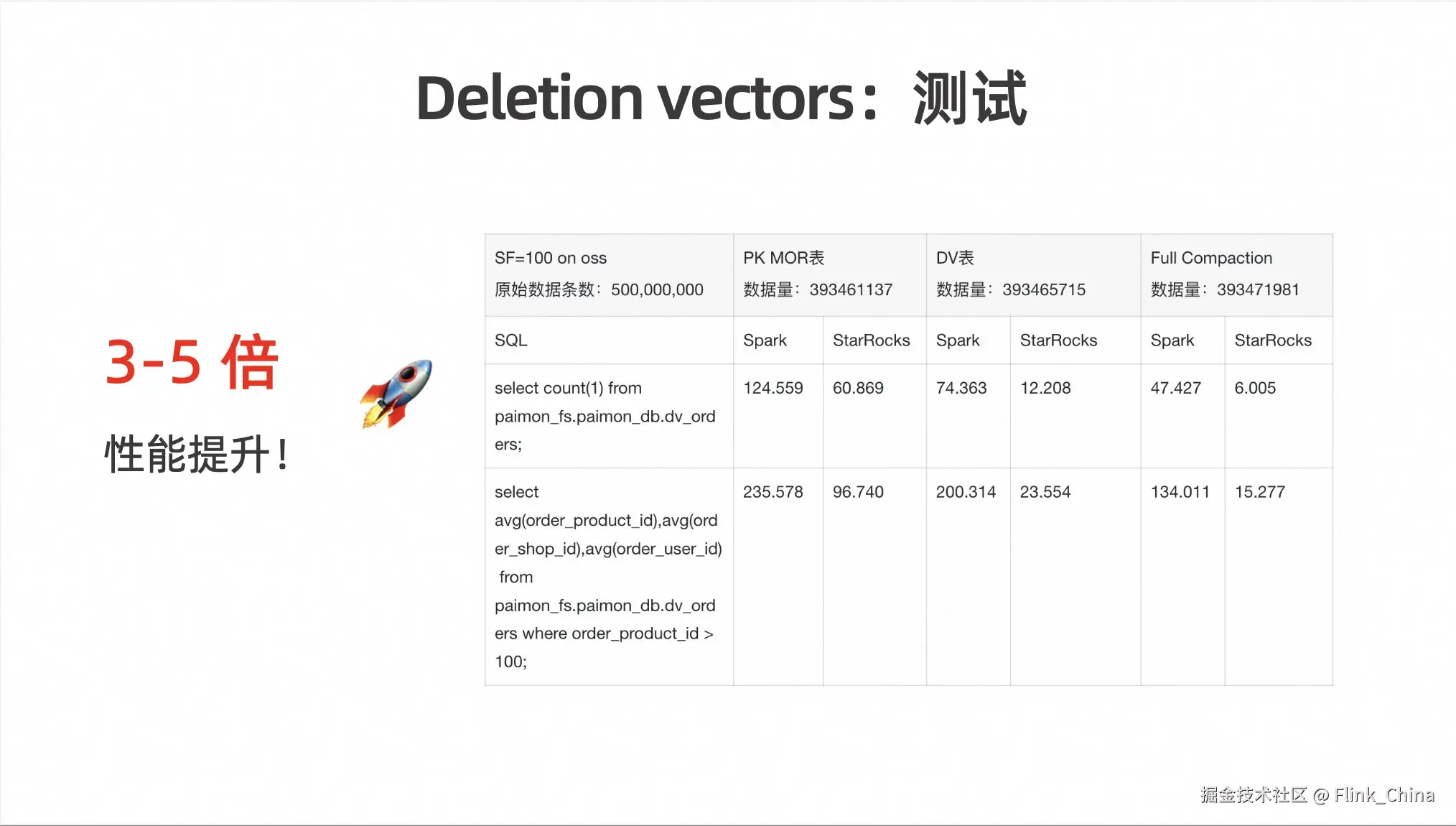 在这个过程上,Deletion Vectors 能达到的查询效果就是支持过滤下推到文件,也解放了查询的并发限制。而且更为关键的是,它支持了 StarRocks、Doris 等 Native 语言的简单集成。这样 Native 语言就不需要考虑复杂的 Merge,直接基于文件加 Deletion Vectors 即可进行高效的向量化查询。