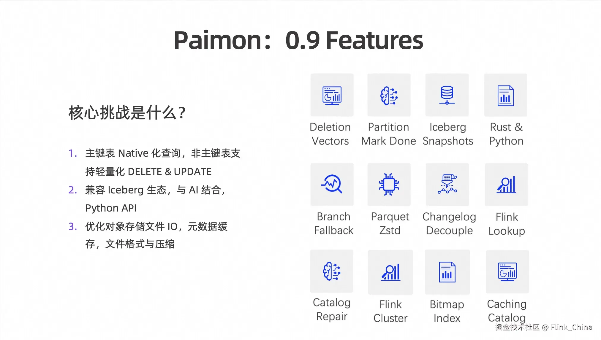 第一个是主键表,主键表是 Paimon 一个核心能力,它是区别于 Iceberg 最大一个特点,所以主键表 Native 化查询性能是比较关键的。在0.8版本中,我们引入了 Deletion Vectors,并将在 0.9 版本中进一步巩固这一功能,并且非主键表也支持轻量化的 DELETE & UPDATE。