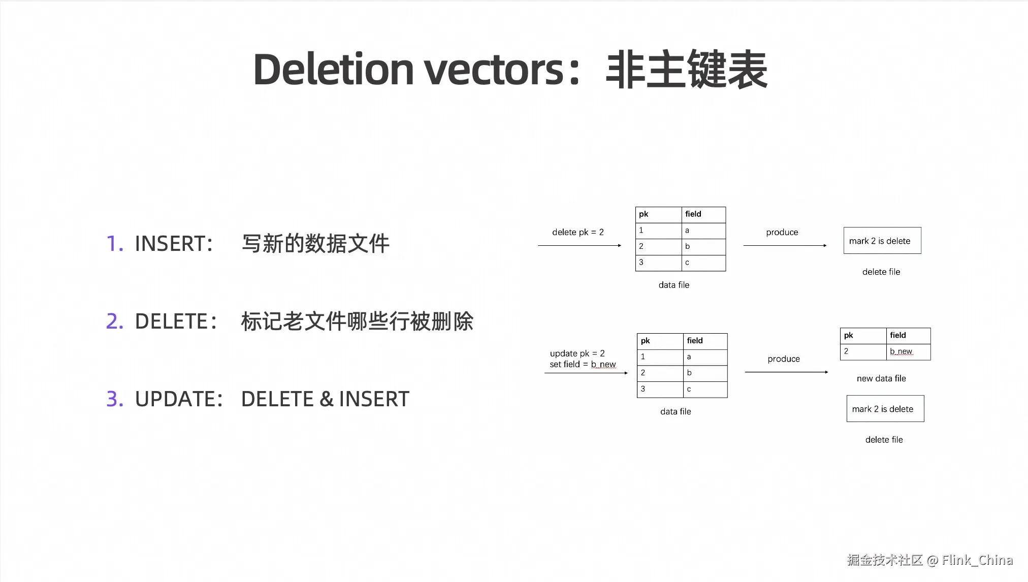 为了满足这一需求,从 0.8 版本开始,Paimon 引入了 Deletion Vectors。这是一种 Merge On Write 的模式,通过写时标记老文件哪些行被删除,实现快速更新,同时尽量不影响查询性能。