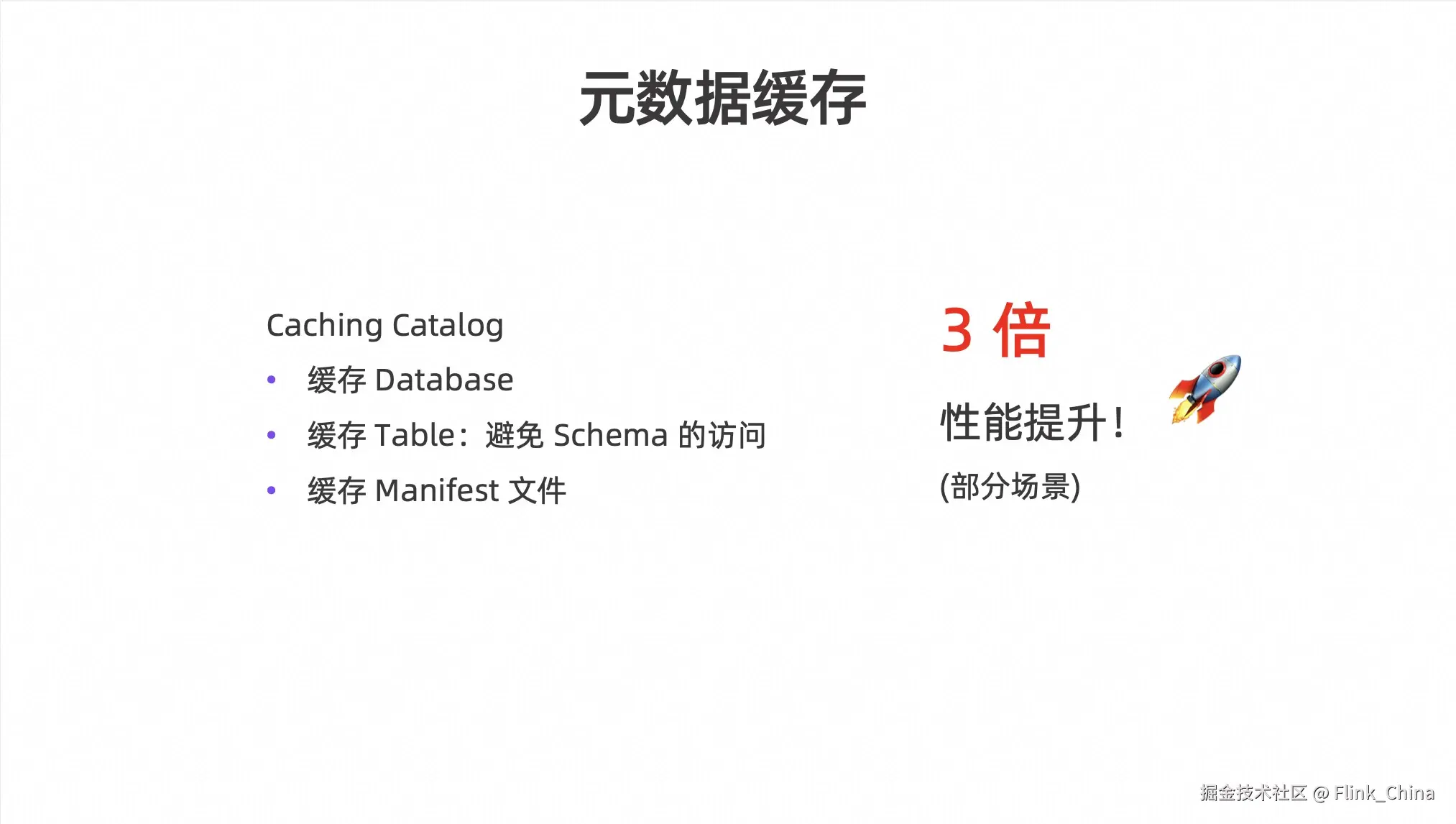 最后,在0.9 版本中,Paimon 研发了 Caching Catalog 功能。它会自动维护对 Database 的 Cache 和对 Table 的 Cache 来避免Schema的访问,以及也会自动维护 Manifest 文件的 Cache。经过一些测试发现,对于需要反复读取表的场景,Caching Catalog 能够带来整体性能三倍的提升。