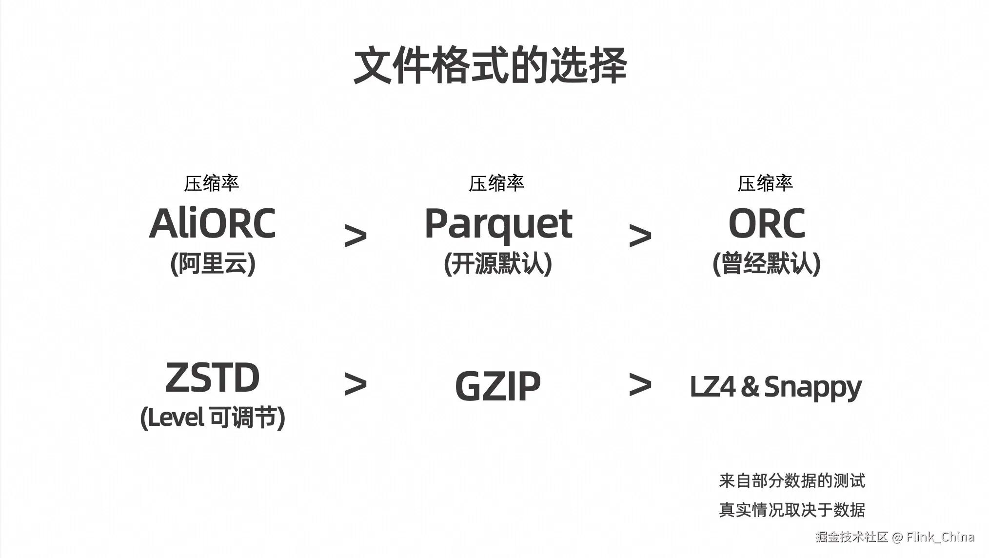 首先,在文件格式的选择上,要尽可能选择压缩率更高的格式。在内部和部分外部测试中发现,Parquet 格式的压缩率比 ORC 稍好一些。当然,这取决于具体的测试数据。因此,在0.9版本中,Paimon 将 Parquet 作为默认的开源文件格式。