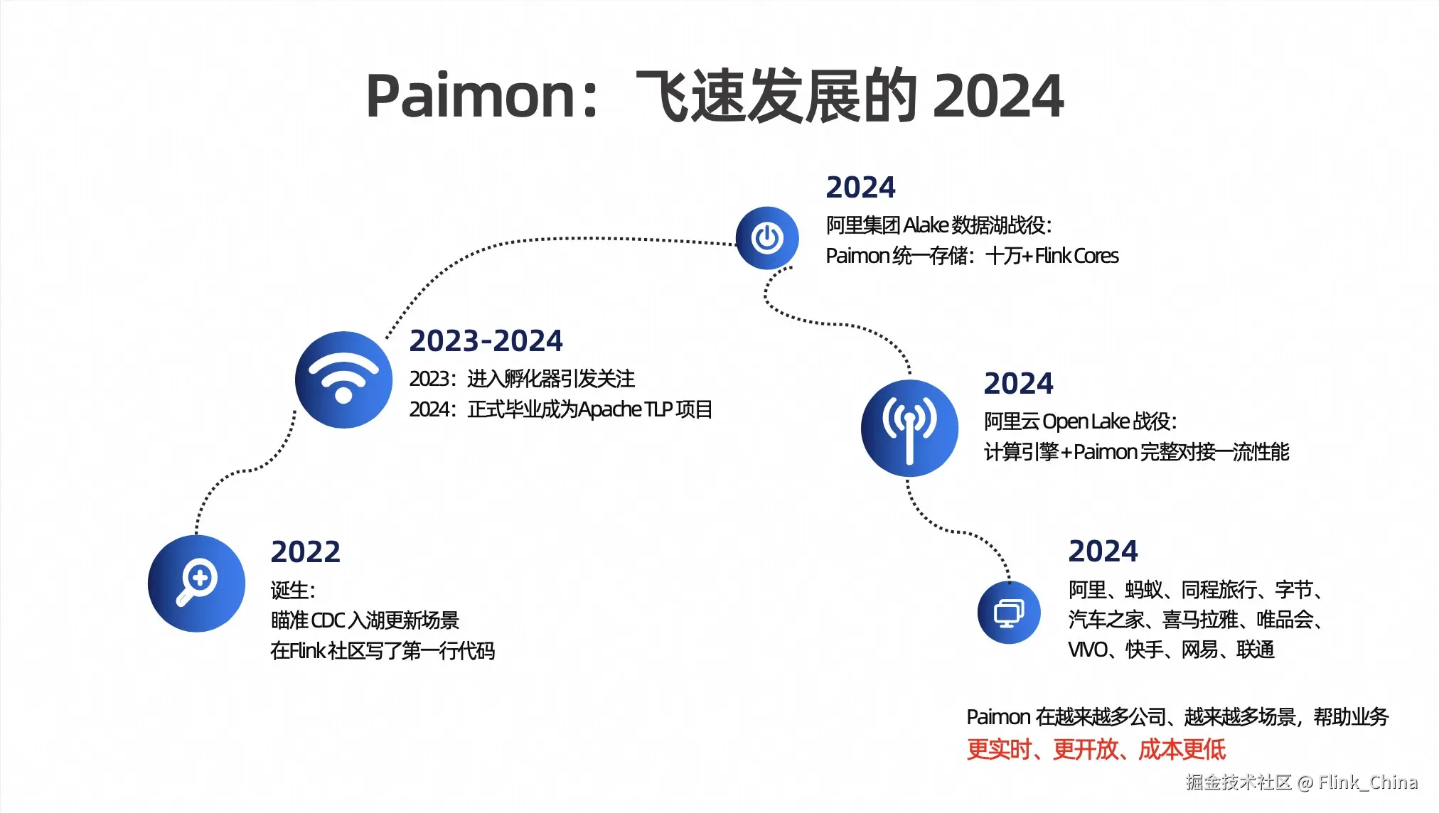 Paimon 诞生于 2022 年的 Flink 社区,并在 2023 年由 Flink Table Store 正式更名为 Apache Paimon,是一个完全由社区推动成长的项目。在短短不到3年的时间里,Paimon 已经有了飞速的发展,并且得到开源社区的一致认可,2023 年 Paimon 进入了 Apache 孵化器,并在 2024 年正式毕业成为了 Apache 顶级项目(TLP)。