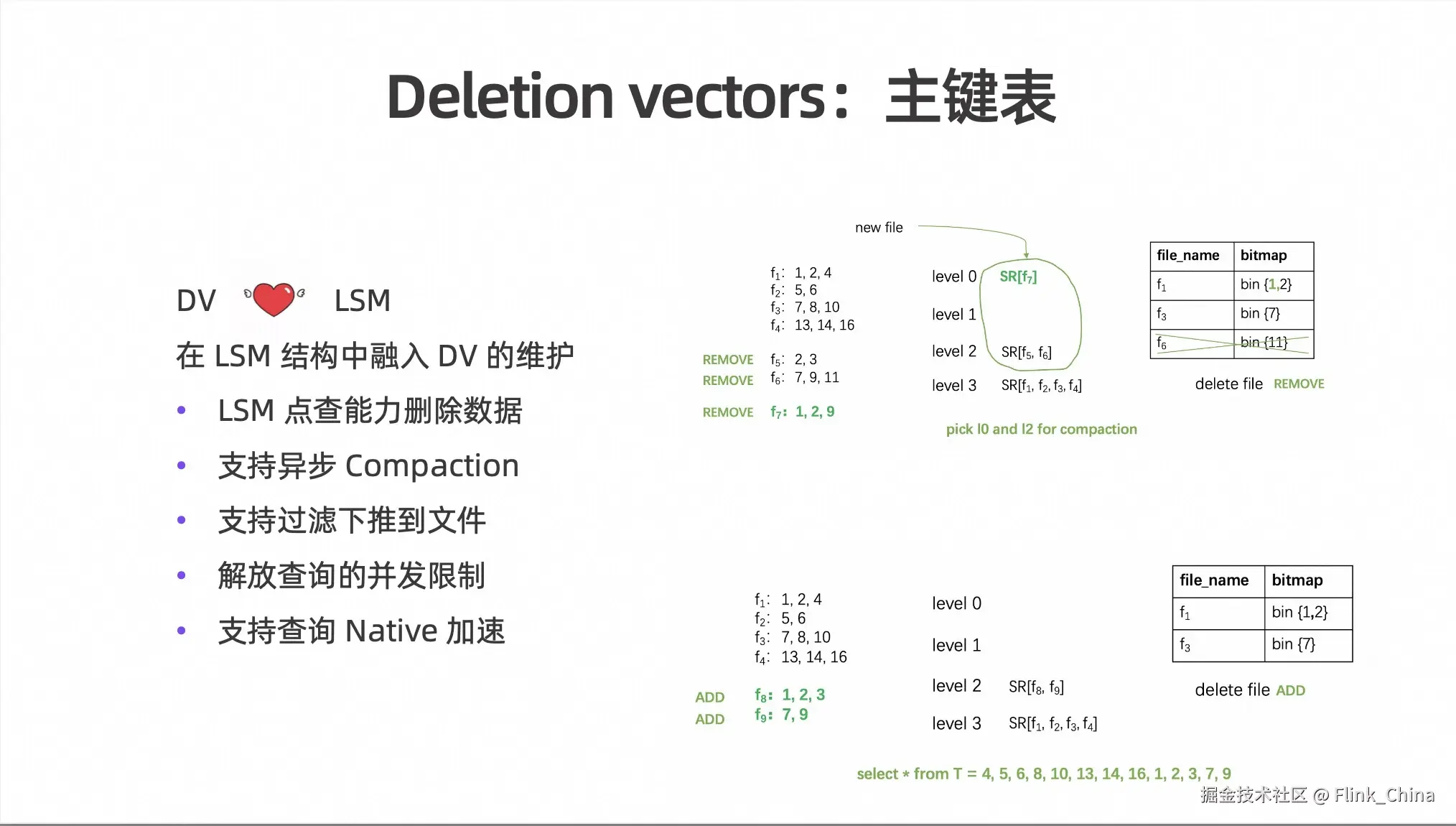 那么如何在主键表中融入 Deletion Vectors?Paimon 在这里做出了一些创新的设计,比如如何在 LSM 结构中融入 Deletion Vectors 的维护,原理可以看上图右边的俩张图。