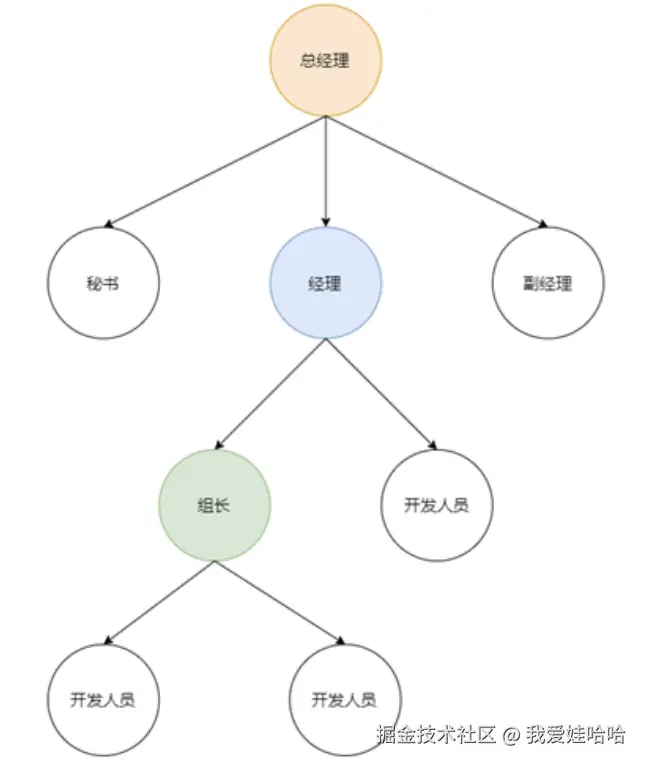 组合模式最常见的结构就是树形结构,通过上面的三个角色就可以很方便地构建树形结构。我们可以结合现实中的例子来理解,比如,一个公司中有总经理,在总经理之下有经理、秘书、副经理等,而在经理之下则有组长、开发人员等,其结构图大致如下:
