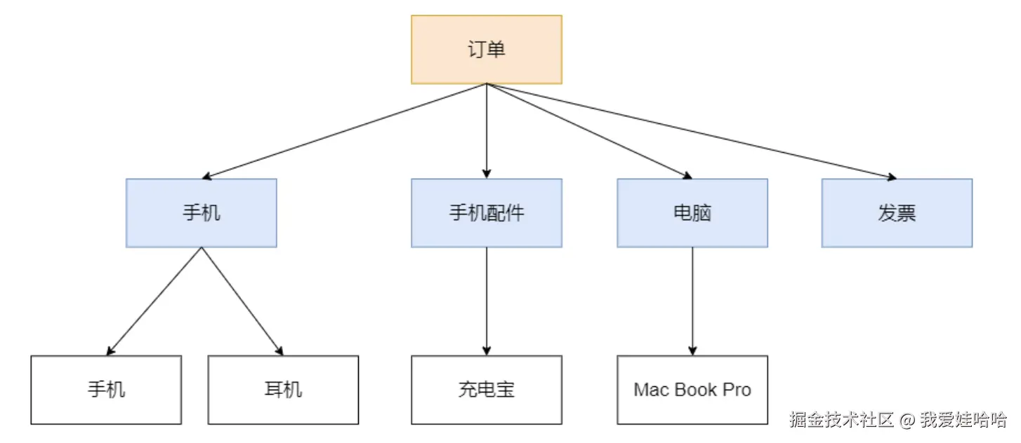 从上面的简图可以看到,一个订单中可能通常会包含各类商品、发票等信息。在现实中,每个商品都会被放到一个快递盒中,然后小的盒子又可以被放入另一个更大的盒子中,以此类推,整个结构看上去像是一棵“倒过来的树”。