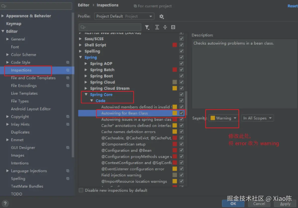 可以进入 Settings,找到 Inspection,并选择其中的 Spring Core -> Code -> Autowiring for Bean Class,将 Error 改为 Warning,即可。0.