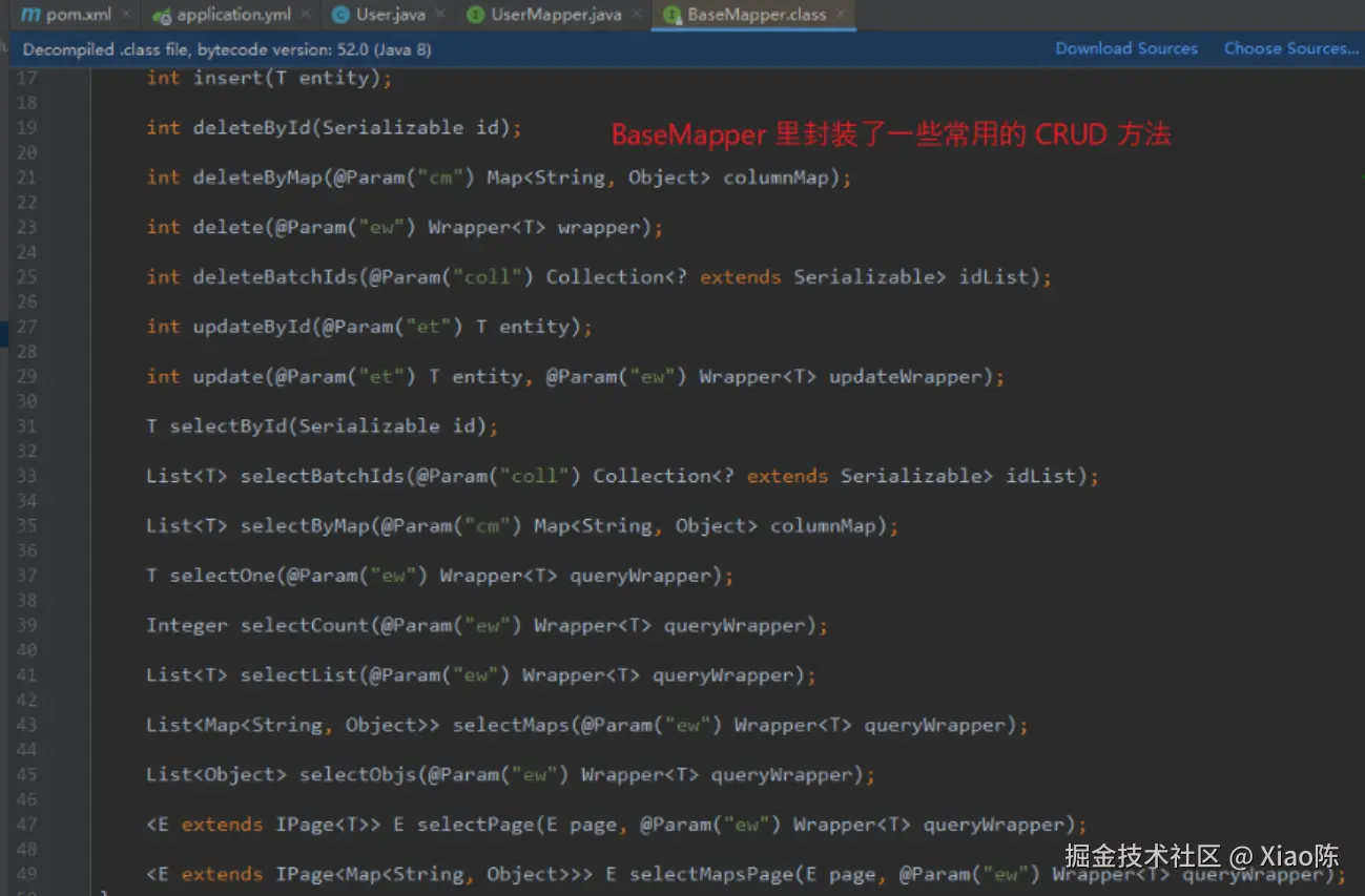 使用代码生成器生成的 mapper 接口中,其继承了 BaseMapper 接口。 而 BaseMapper 接口中封装了一系列 CRUD 常用操作,可以直接使用,而不用自定义 xml 与 sql 语句进行 CRUD 操作(当然根据实际开发需要,自定义 sql 还是有必要的)。