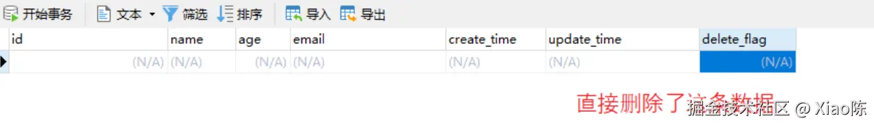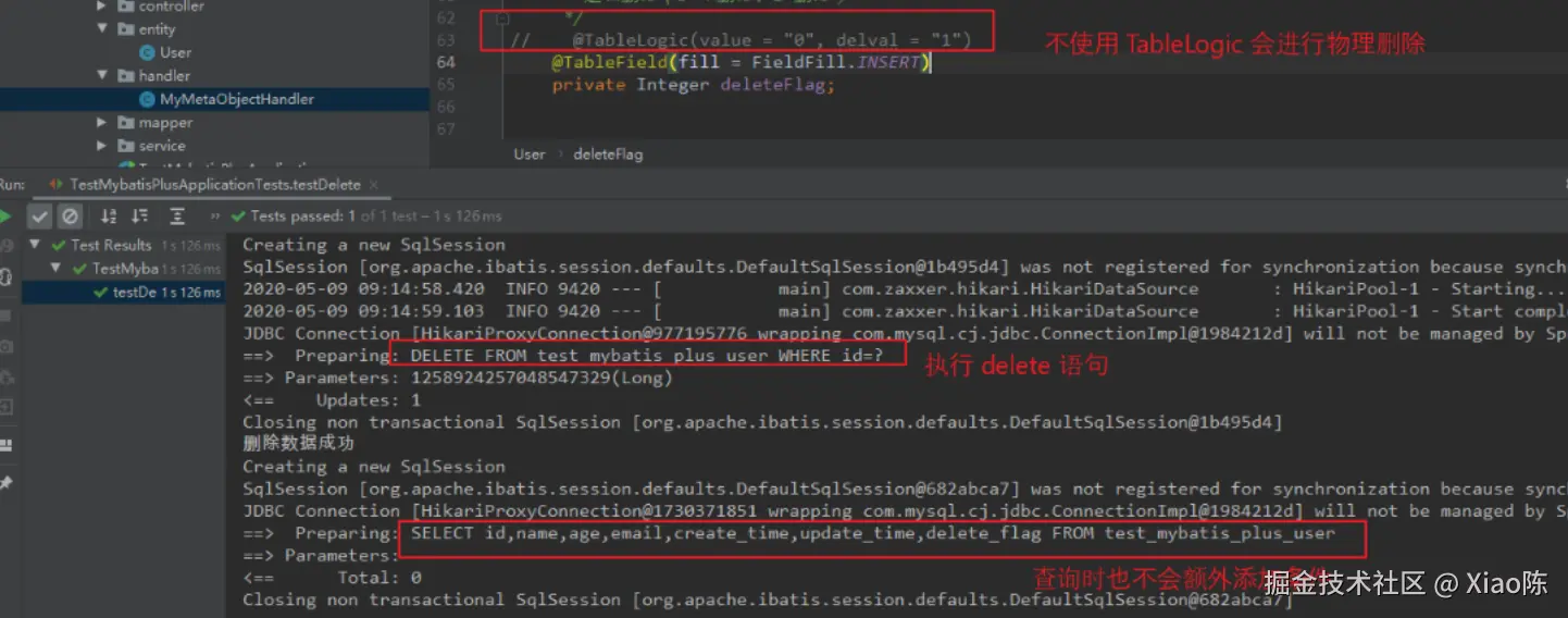若去除 TableLogic 注解,再执行 testDelete 时进行物理删除,直接删除这条数据。