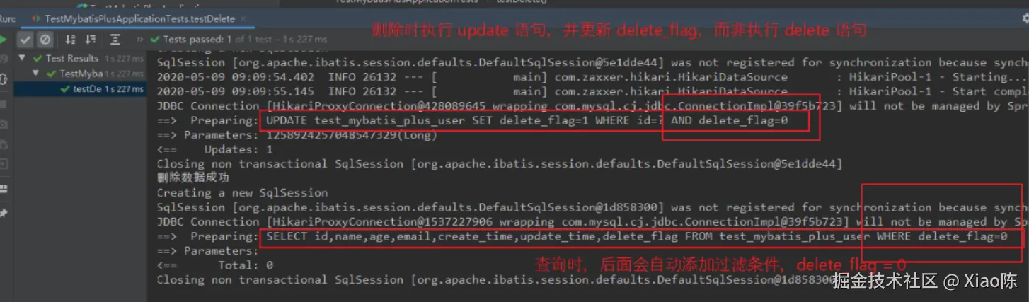 简单测试 使用 mybatis-plus 封装好的方法时,会自动添加逻辑删除的功能。 若是自定义的 sql 语句,需要手动添加逻辑。