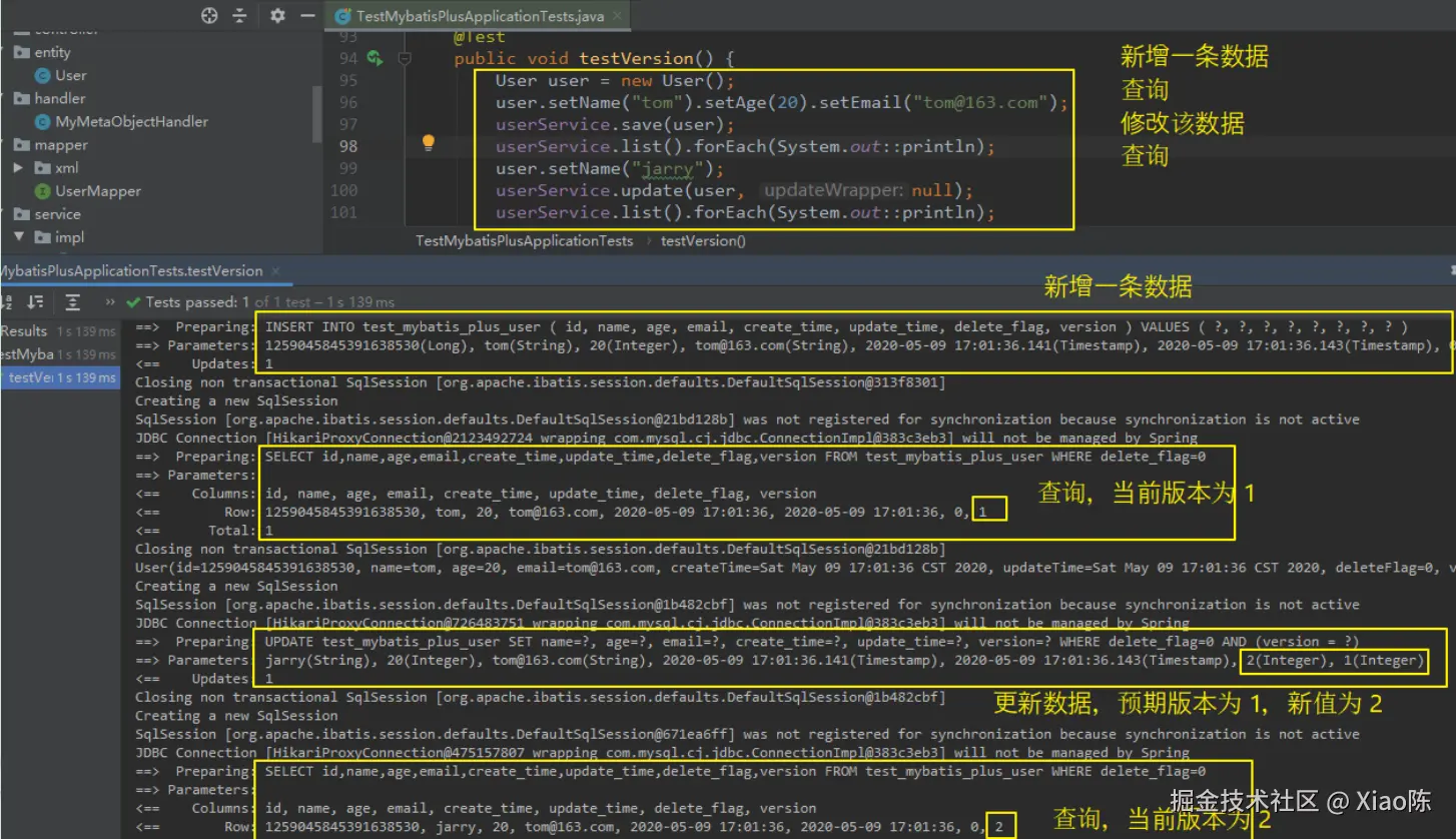 /** * 版本号(用于乐观锁, 默认为 1) */ @Version @TableField(fill = FieldFill.INSERT) private Integer version; @Override public void insertFill(MetaObject metaObject) { this.strictInsertFill(metaObject, "version", Integer.class, 1); }Step4:简单测试一下,可以看一下控制台打印的sql语句。