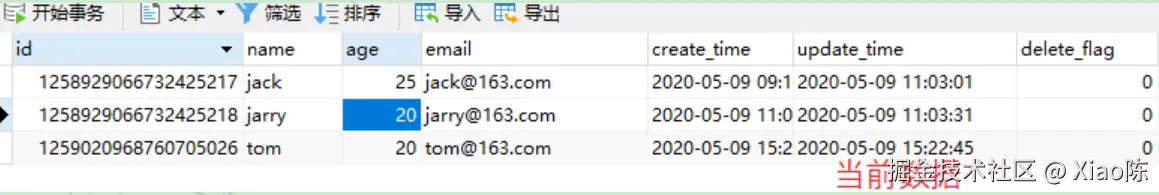 @Test public void testQueryWrapper() { // Step1:创建一个 QueryWrapper 对象 QueryWrapper<User> queryWrapper = new QueryWrapper<>(); // Step2: 构造查询条件 queryWrapper .select("id", "name", "age") .eq("age", 20) .like("name", "j"); // Step3:执行查询 userService .list(queryWrapper) .forEach(System.out::println); }当前数据库数据如下: