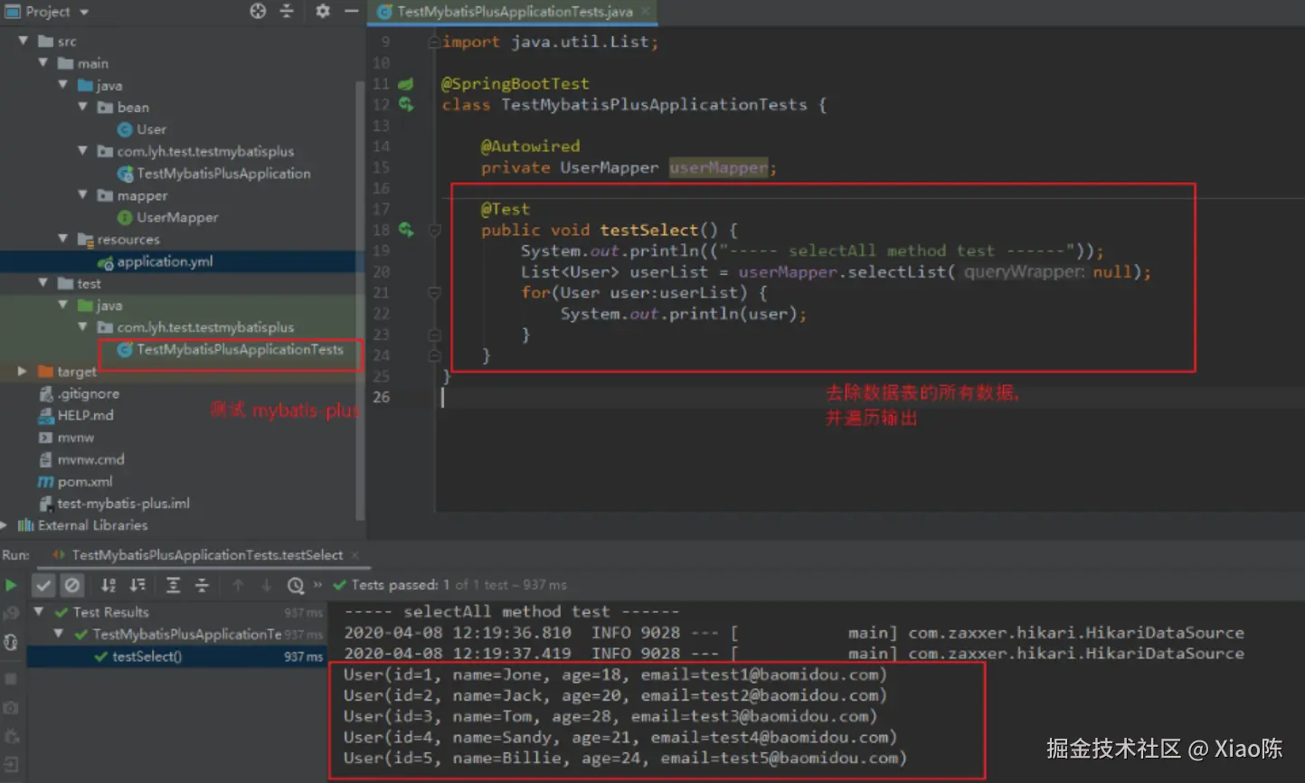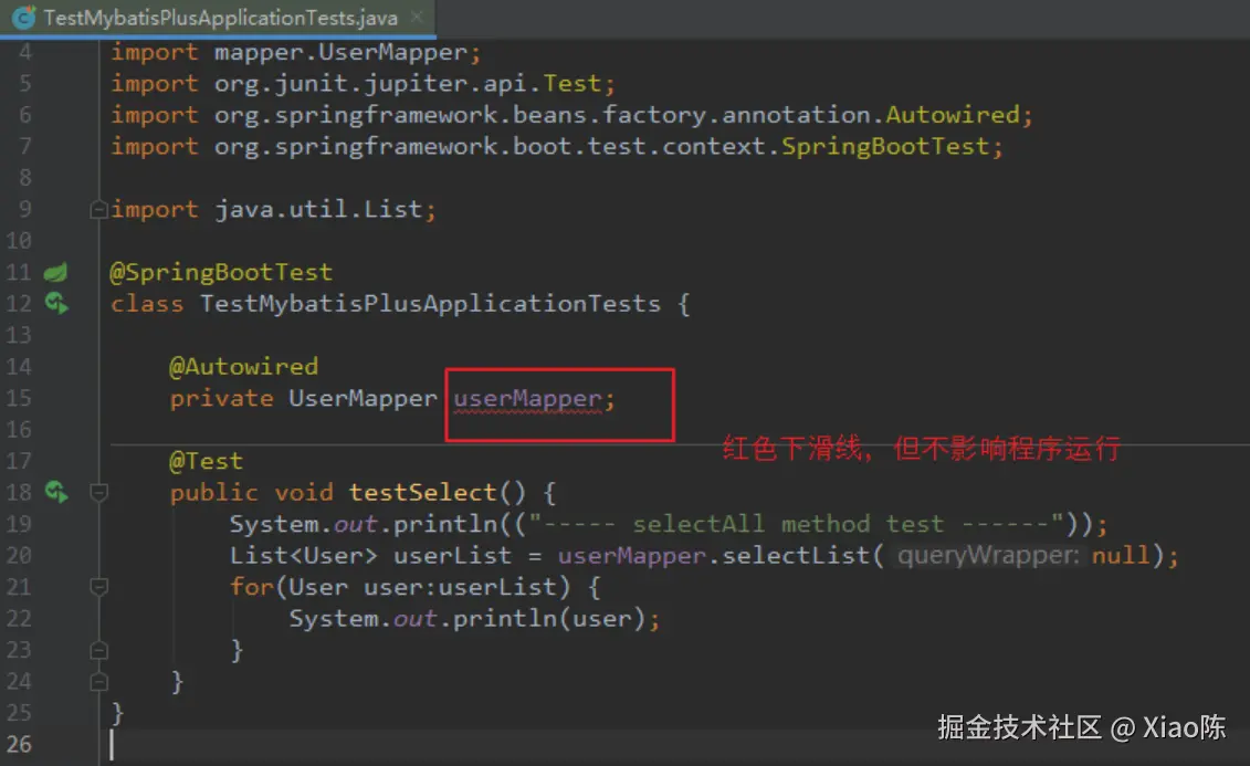 import org.mybatis.spring.annotation.MapperScan; import org.springframework.boot.SpringApplication; import org.springframework.boot.autoconfigure.SpringBootApplication; @MapperScan("mapper") @SpringBootApplication public class TestMybatisPlusApplication { public static void main(String[] args) { SpringApplication.run(TestMybatisPlusApplication.class, args); } }Step2:写一个测试类测试一下。