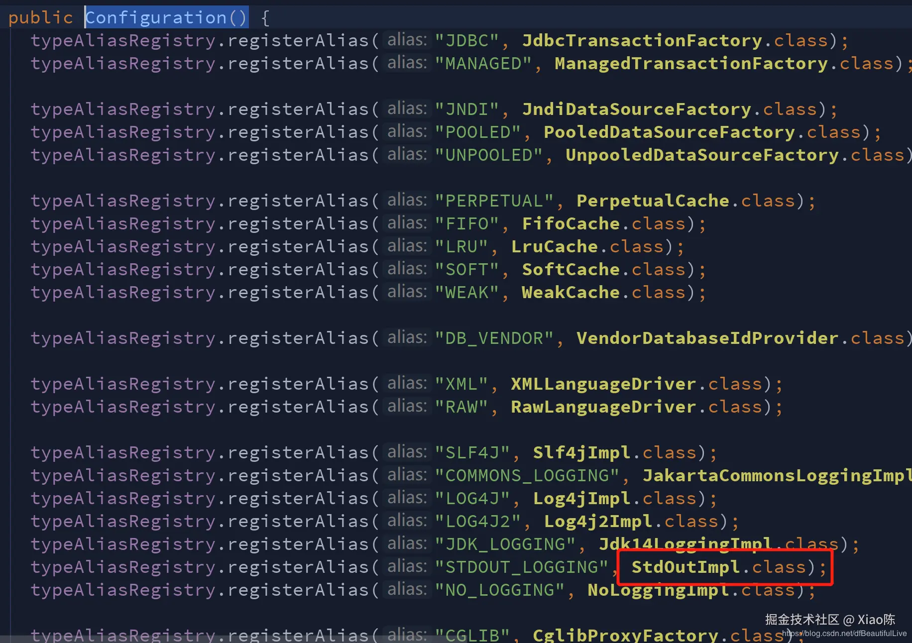 点击setLogImpl看源码,找到Configuration()构造方法,就可以看见了