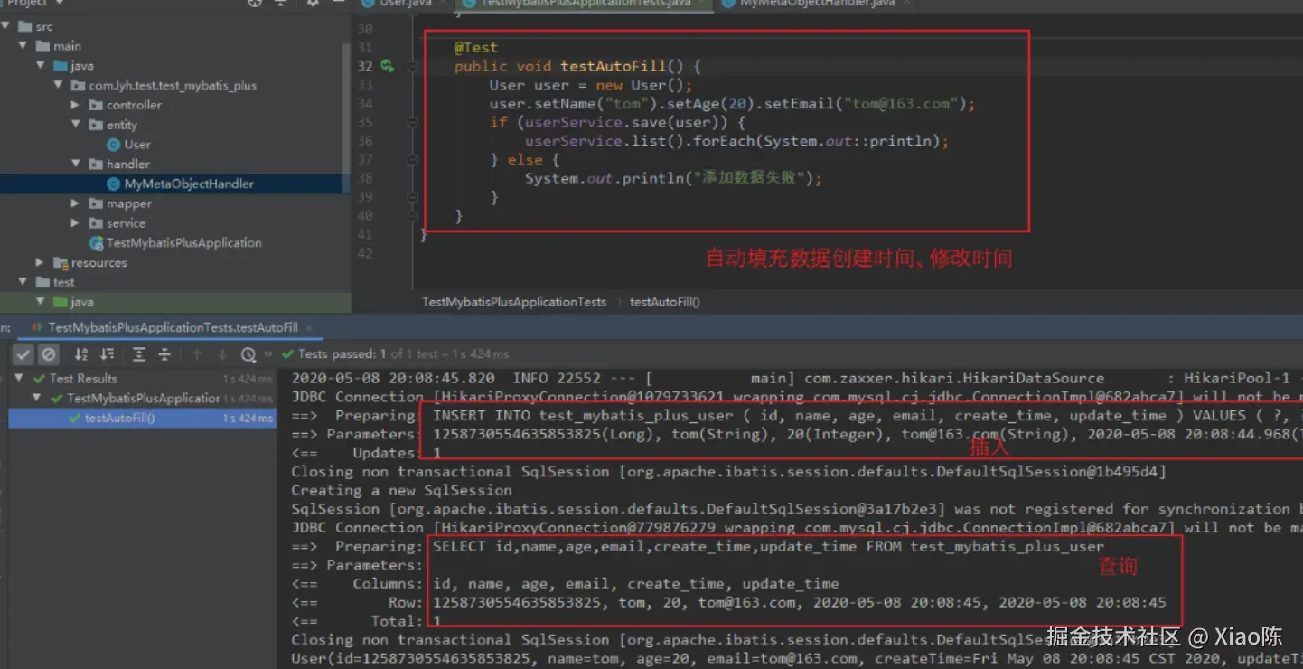 import com.baomidou.mybatisplus.core.handlers.MetaObjectHandler; import org.apache.ibatis.reflection.MetaObject; import org.springframework.stereotype.Component; import java.util.Date; @Component public class MyMetaObjectHandler implements MetaObjectHandler { @Override public void insertFill(MetaObject metaObject) { this.strictInsertFill(metaObject, "createTime", Date.class, new Date()); this.strictInsertFill(metaObject, "updateTime", Date.class, new Date()); } @Override public void updateFill(MetaObject metaObject) { this.strictUpdateFill(metaObject, "updateTime", Date.class, new Date()); } }Step3: 简单测试一下。