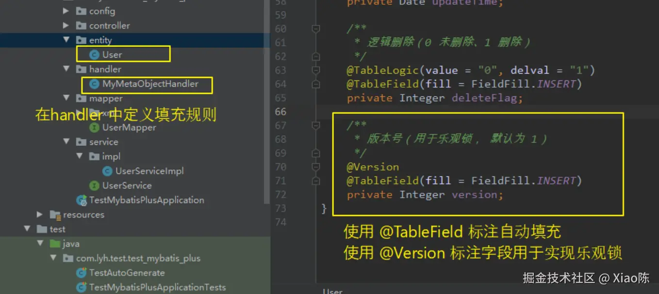 CREATE TABLE test_mybatis_plus_user ( id BIGINT NOT NULL COMMENT '主键ID', name VARCHAR(30) NULL DEFAULT NULL COMMENT '姓名', age INT(11) NULL DEFAULT NULL COMMENT '年龄', email VARCHAR(50) NULL DEFAULT NULL COMMENT '邮箱', create_time timestamp NULL DEFAULT NULL COMMENT '创建时间', update_time timestamp NULL DEFAULT NULL COMMENT '最后修改时间', delete_flag tinyint(1) NULL DEFAULT NULL COMMENT '逻辑删除(0 未删除、1 删除)', version int NULL DEFAULT NULL COMMENT '版本号(用于乐观锁, 默认为 1)', PRIMARY KEY (id) );Step3:使用 @Version 注解标注对应的实体类。可以通过 @TableField 进行数据自动填充。