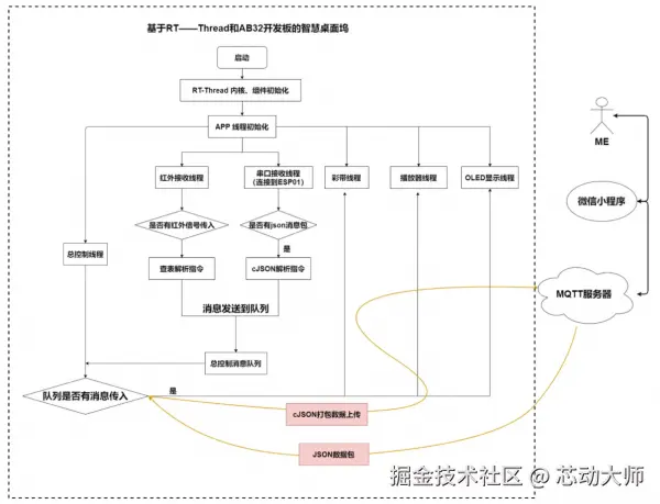 几个硬件设备都是分模块编写、耦合度较低,也较容易理解代码的用途。 整个软件的流程如下,主要是分为几个线程,通过RT-Thread来实现多线程的交互。网络端使用MQTT服务器来实现人机交互。