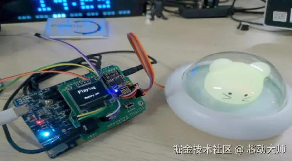 我基于这个开发板制作了一款桌面小工具,它是一个小巧、功能丰富、具有实用价值的桌面物联网“控制中枢”。可以实现: 精灵播放音乐时内部有一颗呼吸灯的效果; 精灵可以通过OLED显示当前音乐名字、播放状态; 精灵可以自动连接到MQTT服务器,实现网络交互; 精灵可以通过红外遥控,实现音乐切换和暂停播放; 精灵可以通过手机连接热点配网,配置联网信息,连接 WIFI; 精灵连接有功放模块实现播放TF卡中的音乐; 精灵连接有一个RGB彩灯,在一个精致小夜灯中实现彩虹灯的效果; 精灵连接有一个灯管,实现联网控制灯管,冬天再也不用下床关灯了; 精灵配有自主设计的微信小程序端应用,通过MQTT服务器来实现和精灵的交互。