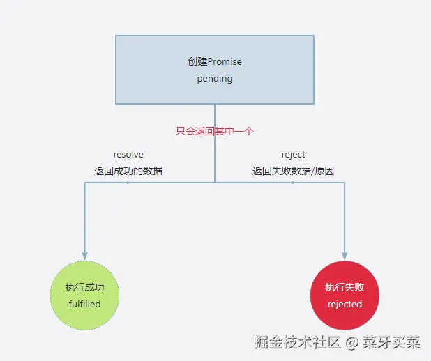 Promise的状态只会从pending转到fulfilled或rejected其中一个,这是必然的、不可改变的,结果只会是成功或者失败的,一旦fulfilled,那么rejected就不会出现,同理,一旦rejected,fulfilled也不会出现,最终的状态只会是这两个中的一个,也就是Promise(承偌)肯定会给你返回一个结果(成功或失败)