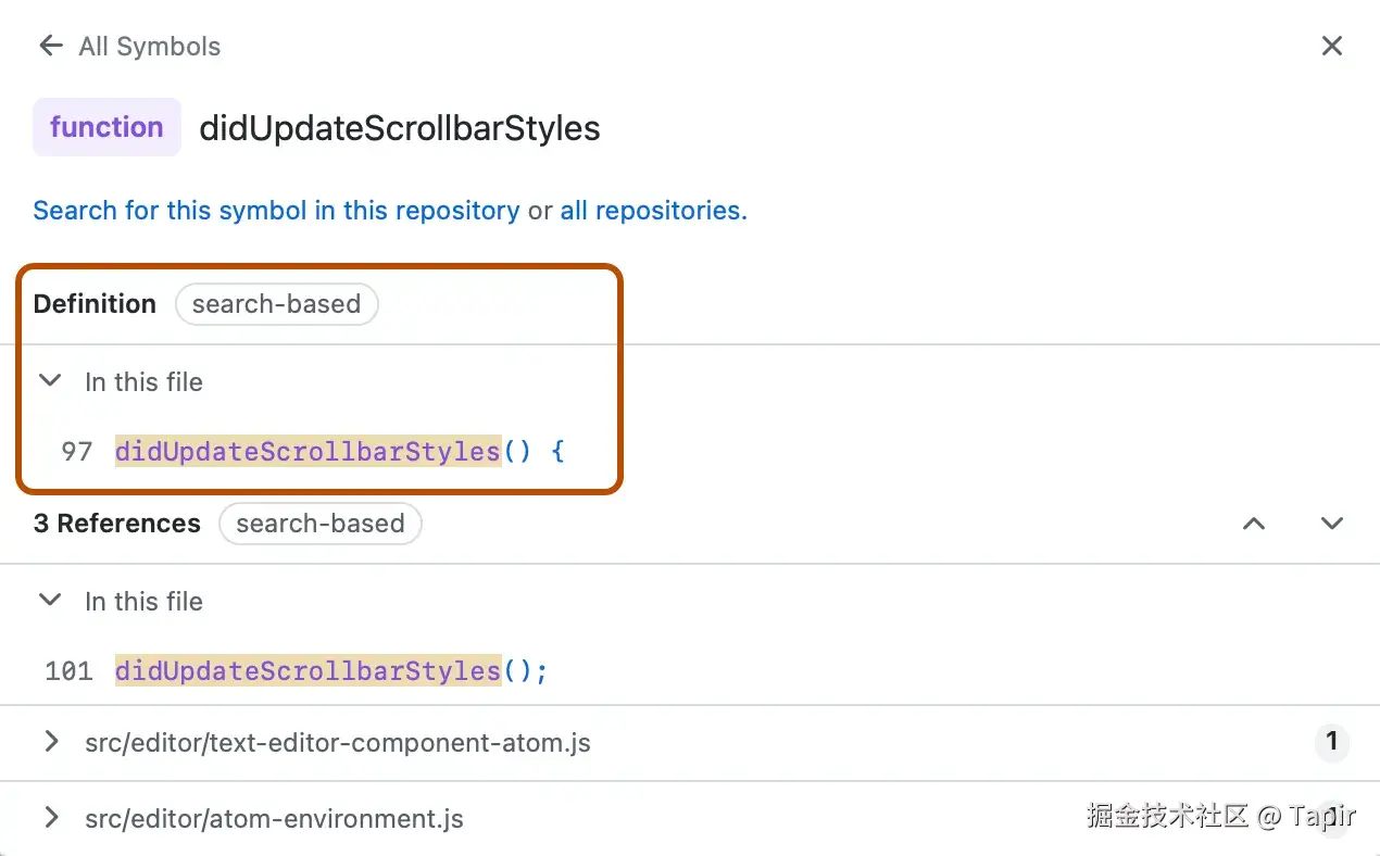 当我们在 Github 中查看源码时,Github 提供了 Navigating code 的能力,帮助我们快速在函数或变量的定义和引用之间跳转,甚至可以跨 Repo 进行。