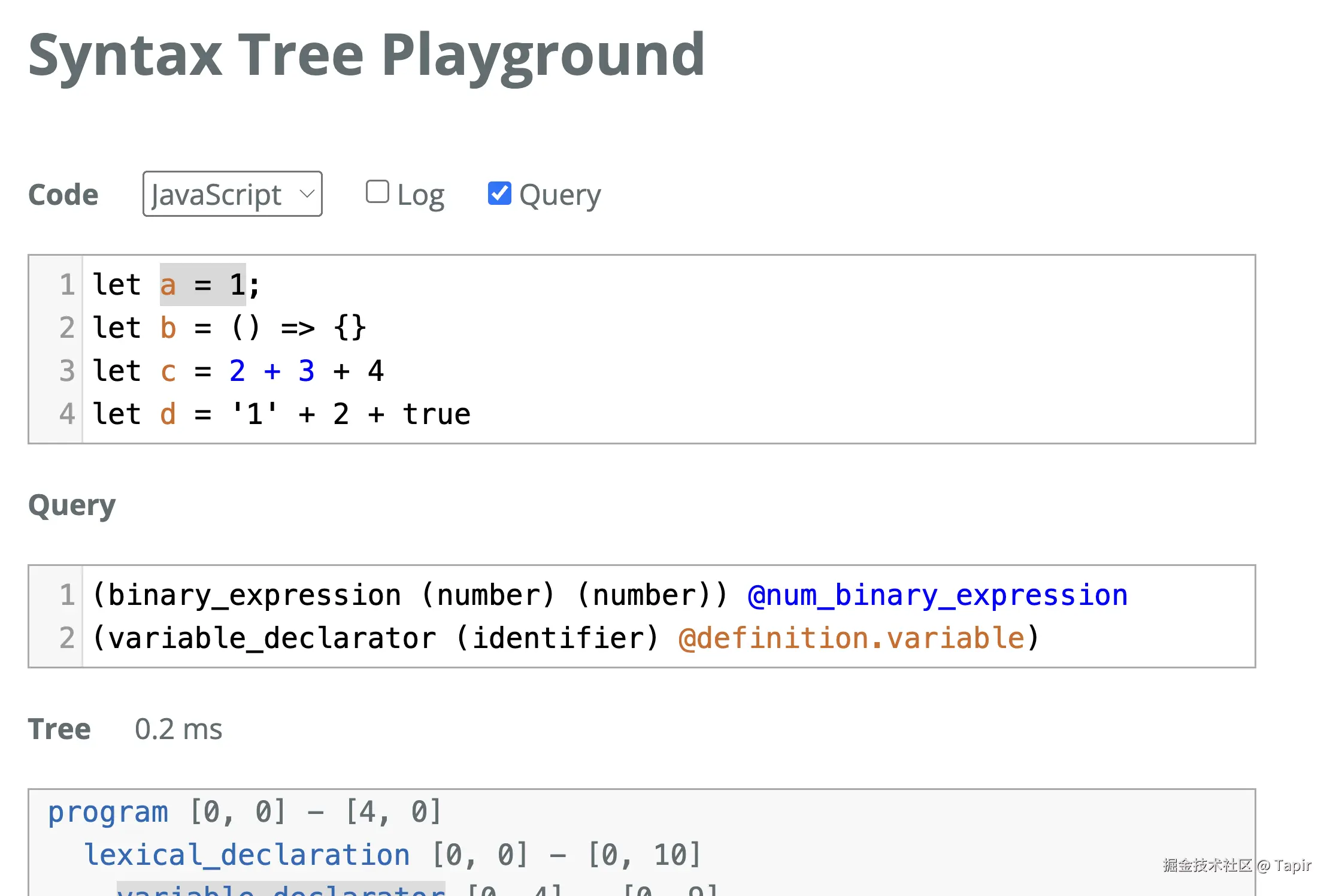 效果可以非常直观的在 Syntax Tree Playground 中看到,不同的捕获节点使用了不同的颜色表示: