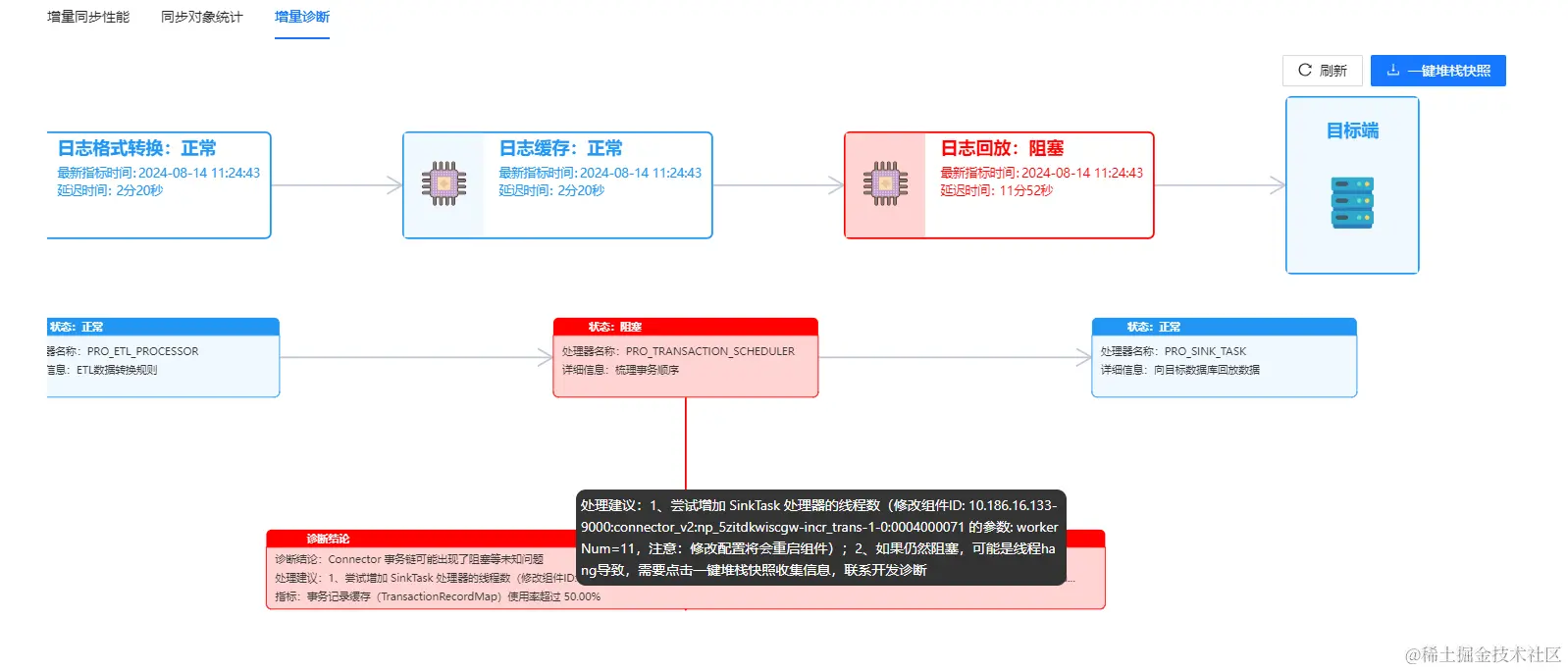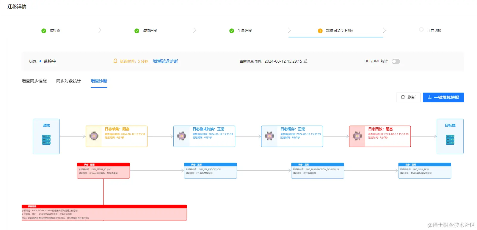 针对上图中出现的增量同步达到了 12 分钟,并且延迟时间还在一直上涨的情况,通过新增的增量延迟诊断功能,我们可以看到数据同步过程中关键节点的延迟情况、出现问题的节点以及对应的处理建议。