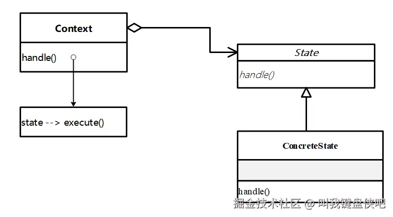 - Context:持有一个 ConcreteState 实例的对象,直接被调用和请求。