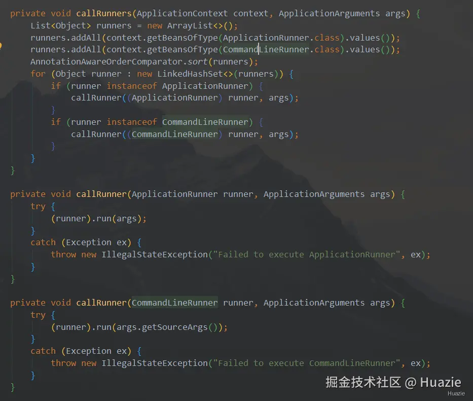 callRunners 方法里面会调用 ApplicationRunner 和 CommandLineRunner 的运行方法。