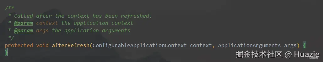 刷新应用上下文之后,调用 afterRefresh 方法。该方法的实现默认为空,可由开发人员自行扩展。