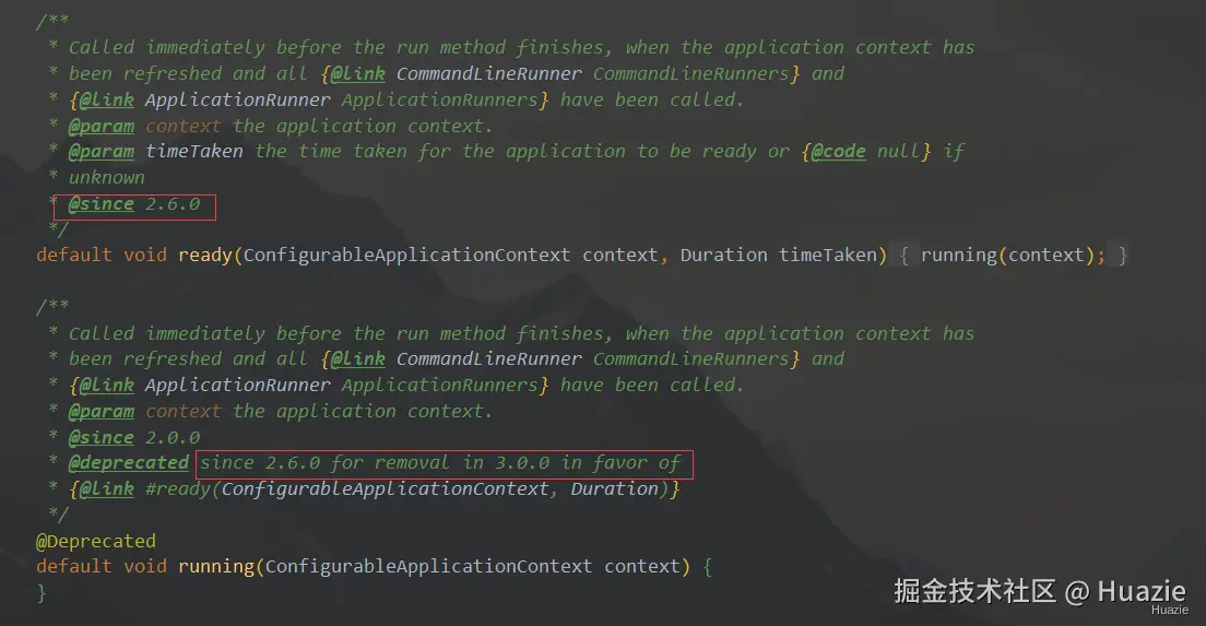 在 Spring Boot 2.6.0 版本之前,大家看到调用的是 SpringApplicationRunListener 的 running 方法。从 Spring Boot 2.6.0 版本开始,新增了 ready 方法替代 running 方法。在 Spring Boot 3.0.0 版本中正式去除 running 方法。