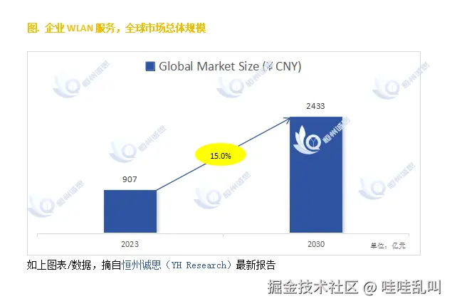 市场规模与增长方面,2023年全球企业WLAN服务市场价值约为907亿元。随着全球经济的逐步复苏和数字化转型的推进,企业WLAN服务市场需求稳步上升。预计到2030年市场规模将接近2433亿元,未来六年CAGR为15.0%。