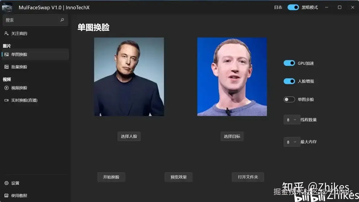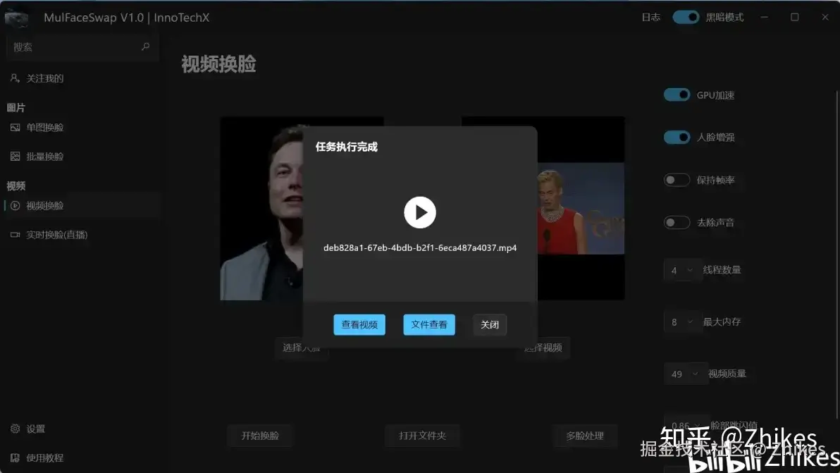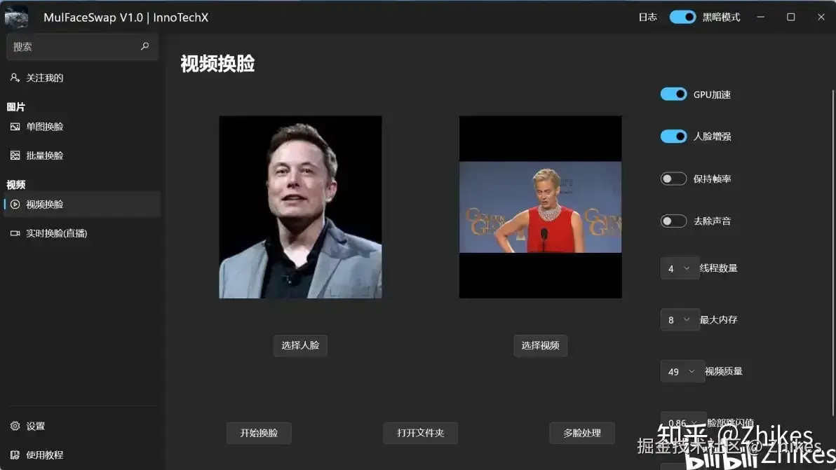 用户可以选择一个视频文件和一张图片,将视频中的所有面孔替换为图片中的面孔,生成新的换脸视频,右侧功能栏囊括原程序所有功能,包括脸部防跳,多脸处理等。