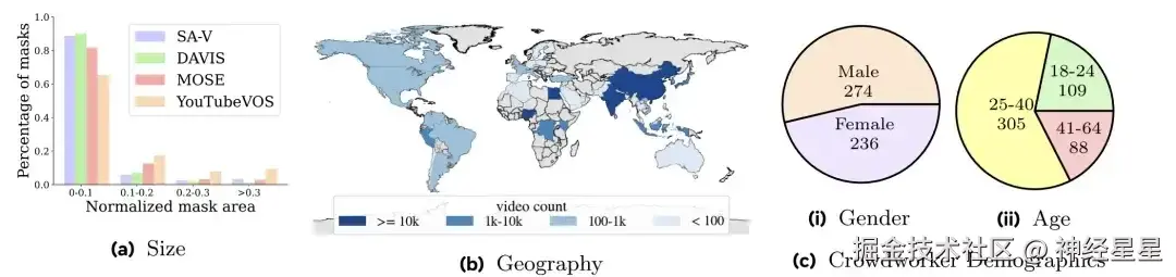 如下图所示,SA-V 中的视频覆盖 47 个国家, 并由不同的参与者拍摄,图 a 可得,与 DAVIS、MOSE 和 YouTubeVOS 掩码大小分布相比,SA-V 小于 0.1 的归一化掩码面积 (normalized mask area) 超过 88%。