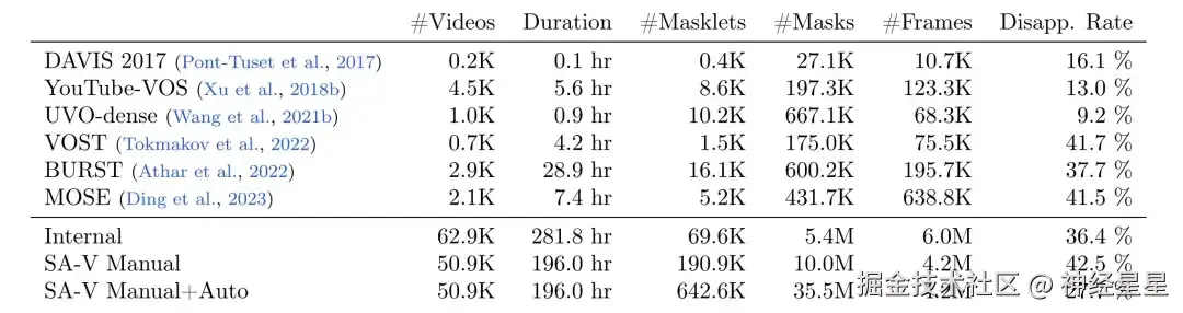 Meta 研究人员使用数据引擎收集了一个大型且多样化的视频分割数据集 SA-V,如下表所示,该数据集包含 50.9K 个视频,642.6K 个 masklets (由 SAM 2 辅助手动注释 191K、由 SAM 2 自动生成 452K ), 与其他常见的视频对象分割 (VOS) 数据集相比,SA-V 在视频、masklets 和 masks 数量上均有大幅提升,其标注的 masks 数量是现有任何 VOS 数据集的 53 倍, 为未来的计算机视觉工作提供了丰富的数据资源。