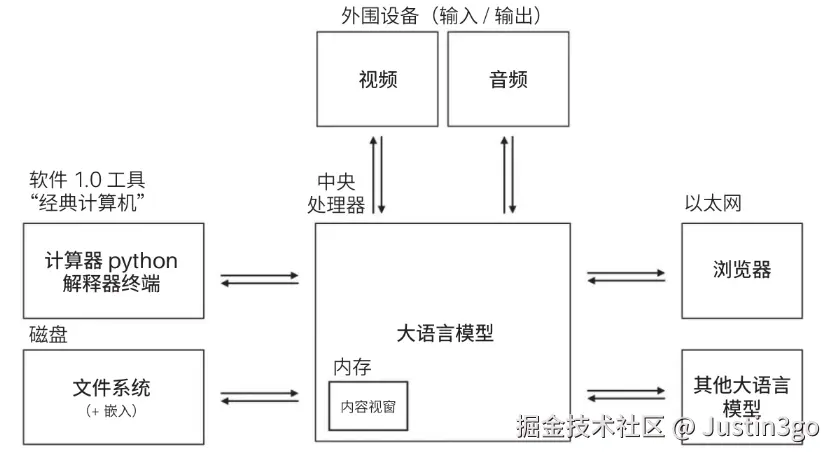 我们可以像使用操作系统一样来使用大语言模型,现在应该叫大型多模态模型更合适。这个系统的核心就是LMM,它就像CPU一样处理进入的数据,计算后给出结果,不同的地方电脑CPU接受十六进制汇编指令,LMM接受自然语言。