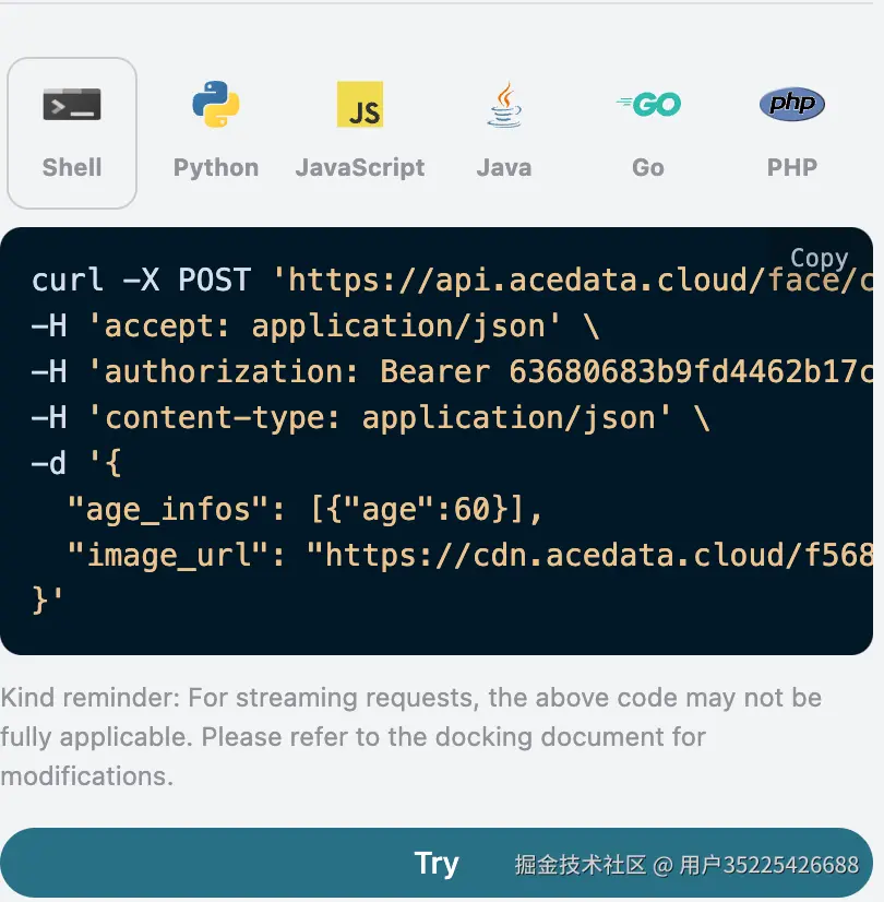 另外如果想生成对应的对接代码,可以直接复制生成,例如 CURL 的代码如下: