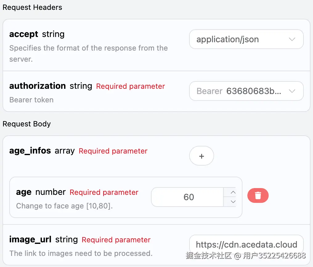 然后我们还需上传关于人脸年龄信息参数 age_infos ,它是一个数组,我们可以传多个信息,我们接下来就可以在界面上填写对应的内容,如图所示: