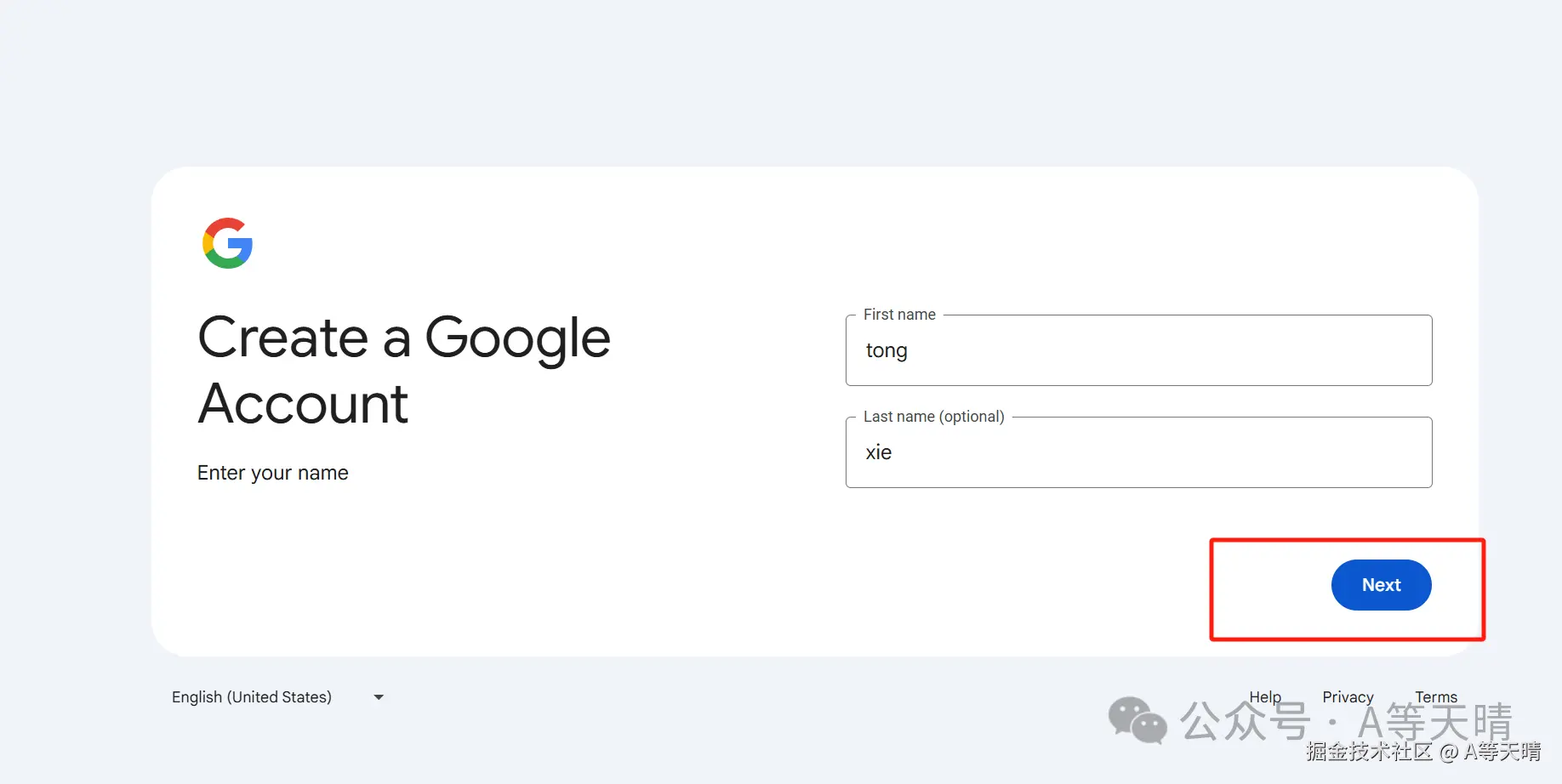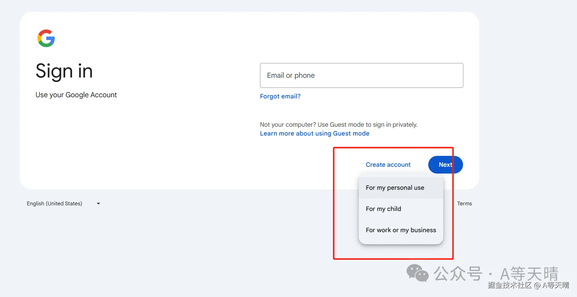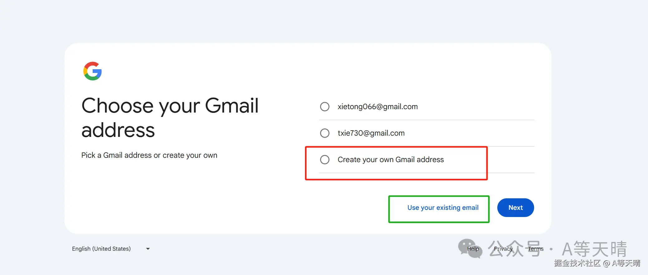 然后这个页面的红色框代表自己填写邮件的地址,绿色框代表使用其他邮箱进行绑定谷歌邮箱,个人推荐点红色框的自己设置一个谷歌地址