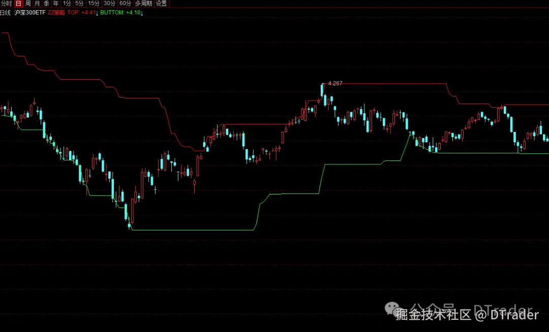 绿色线是BUTTOM 也就是 支撑位,红色线TOP 也就是阻力位