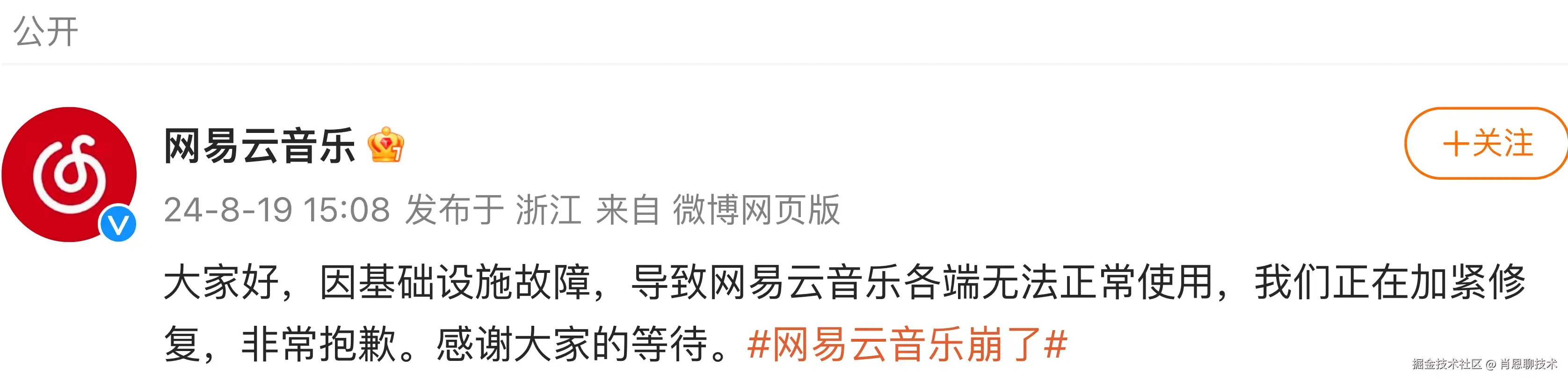 8月19日下午,「网易云音乐」App和网页端遭遇了大规模服务器故障,导致用户无法正常使用服务,并迅速登上微博热搜。故障引发了众多猜测,如删库跑路、服务器迁移或机房起火等。网易云音乐官方微博在当天下午3点回应称,故障是由于基础设施故障导致,并在5点左右基本恢复服务。17:30,官方再次发微博确认故障修复,并否认了不实传言,公布了补偿措施。