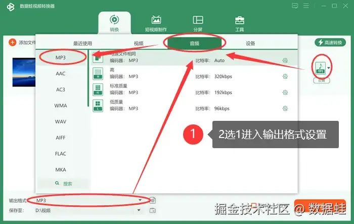 步骤二: 在页面下方,点击 【输出格式】 按钮(或者您也可以选择点击右侧的设置图标进行访问)。这将带您进入视频的输出配置界面。在这个界面中,首先在菜单栏选择 【音频】 类别,并将输出格式明确设置为 【mp3】 格式。