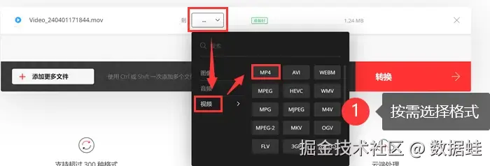 Step2: 选择目标文件后,单击 【…】 ,选择 【视频】 ,然后选择要转换的文件格式。小编最初的视频格式是mov,小编决定将视频转换为mp4格式。您可以选择要转换的格式。如果您需要转换多个视频,可以单击左侧的 【+添加更多文件】 来完成批量转换。