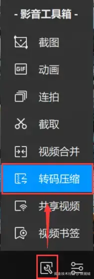 Step 2: 在视频播放界面上,找到并单击右下角的 【视频工具箱】 图标。展开菜单后,选择 【压缩转码】 选项,进入视频格式转换操作界面。
