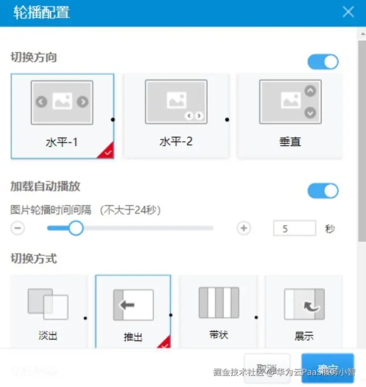 4. 单击“轮播设置”,根据个人实际需求,设置轮播方向、图片播放时间间隔等。