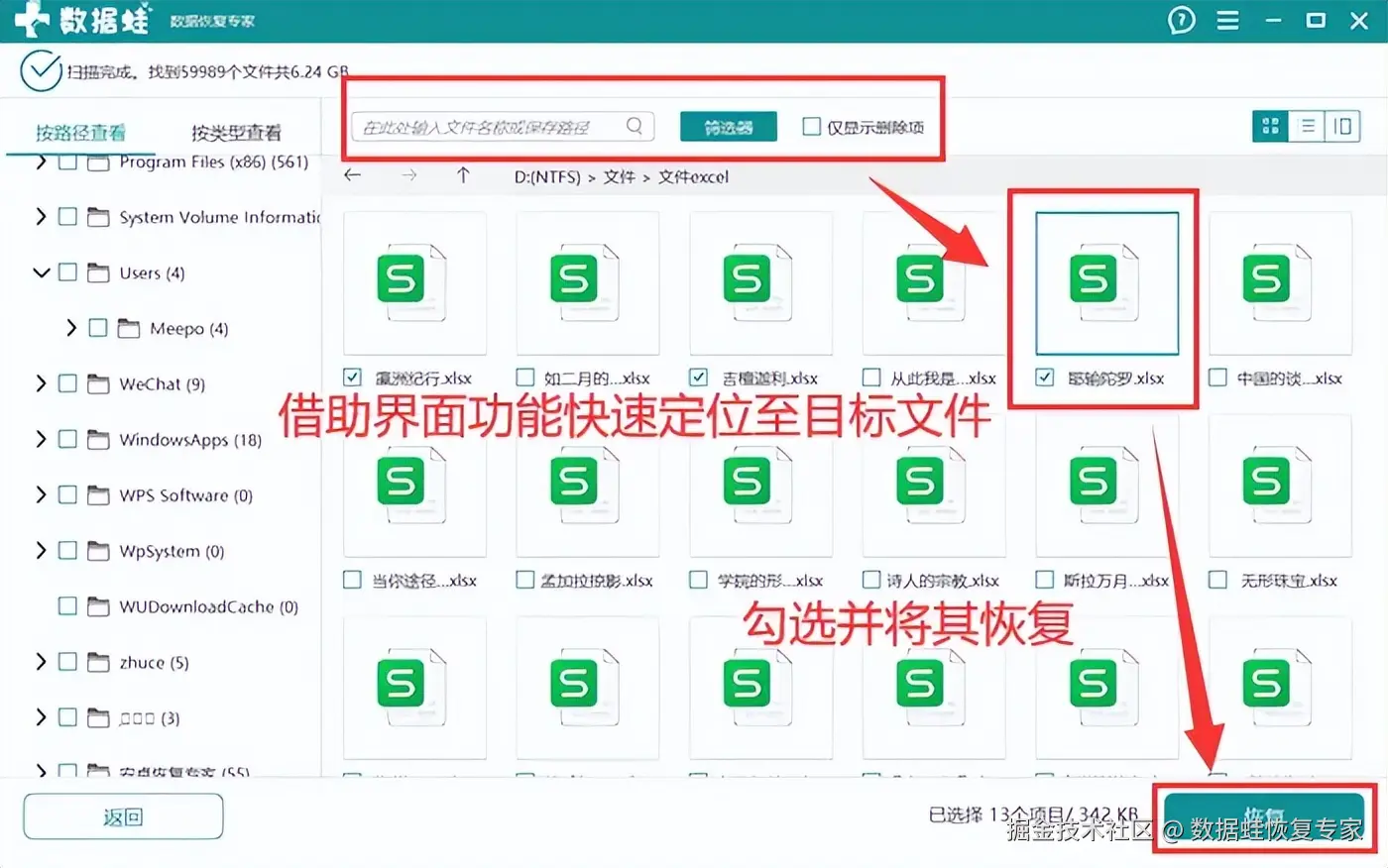步骤3:扫描完毕,你就可以开始查找数据啦!借助界面的搜索、筛选等功能,你可以快速定位到目标文件。经过确认,你可以勾选它们,最后点击 【恢复】 。