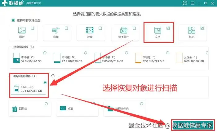 步骤2:安装完成后,打开软件,选择需要恢复的文件类型和U盘,点击 【扫描】 ,开始搜索U盘数据。