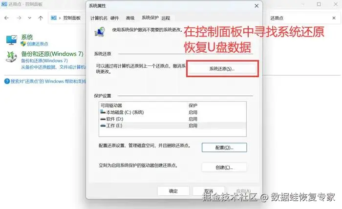 如果你日常创建了系统还原点,那么丢失的U盘数据有很大概率可以还原。你可以进入控制面板,直接搜索“还原点”,然后选择你的U盘驱动器。接下来就按照页面提醒,找回丢失的文件。不过,系统还原可能会导致你的电脑恢复到某个时间点的状态,所以在操作前请确保你已经备份了重要数据。
