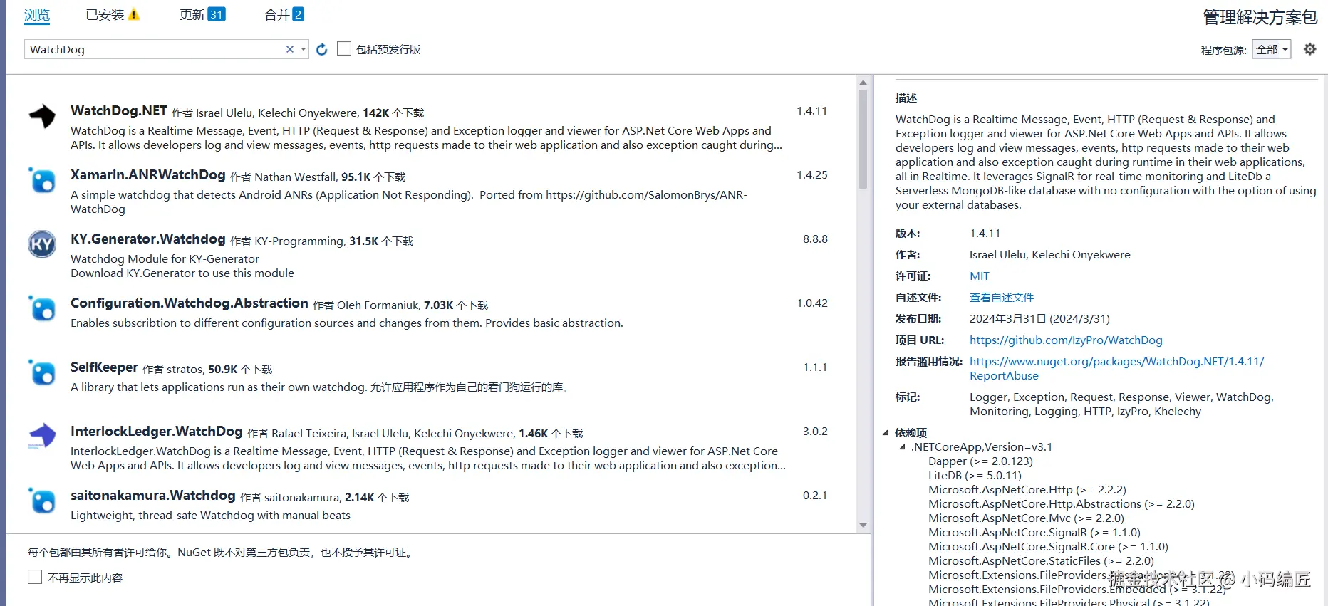 搜索 WatchDog.NETNuGet包进行安装,具体如下图所示: